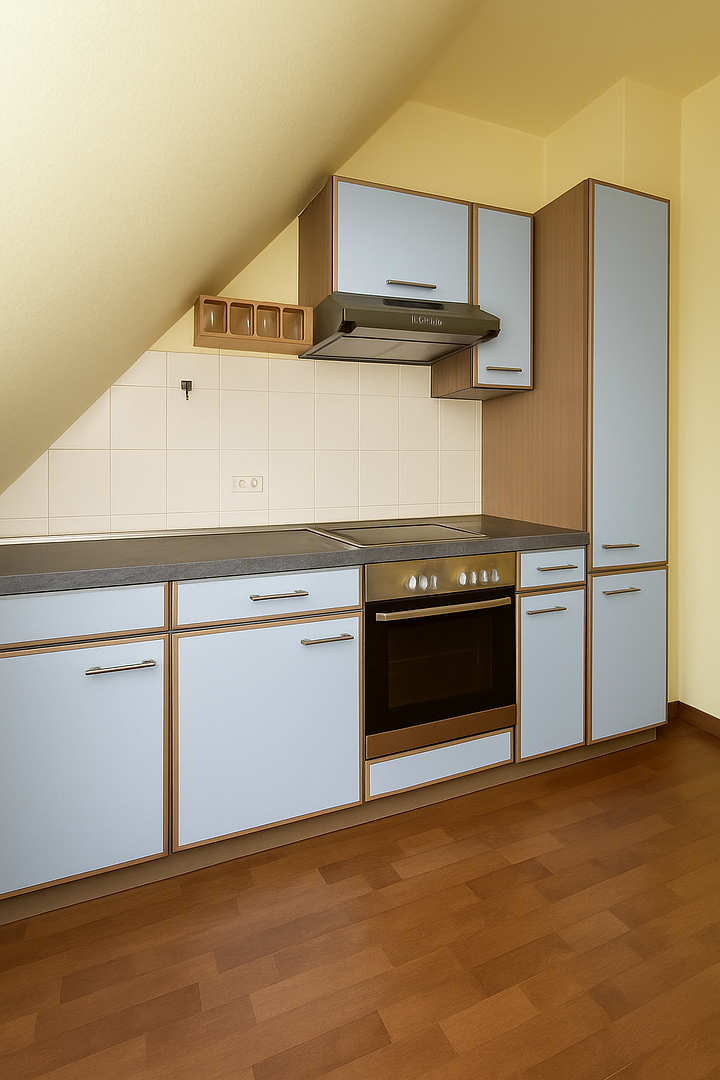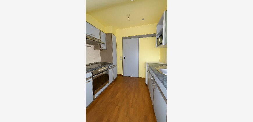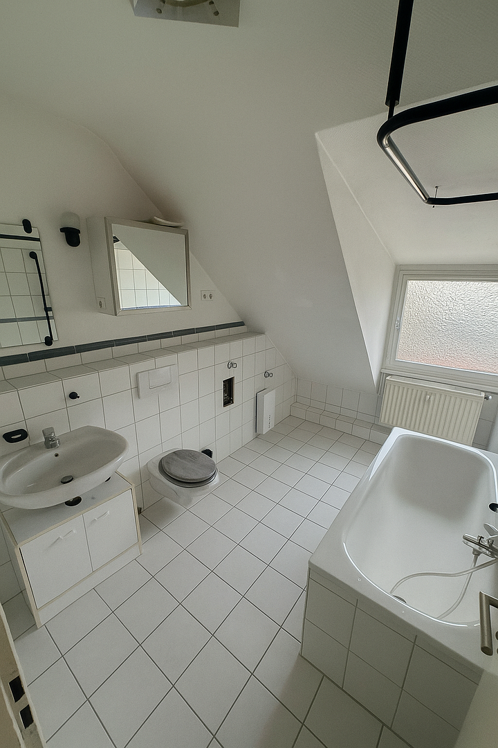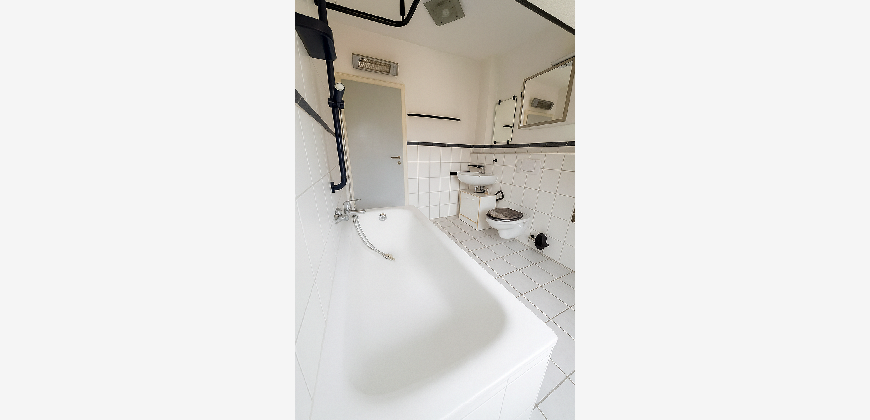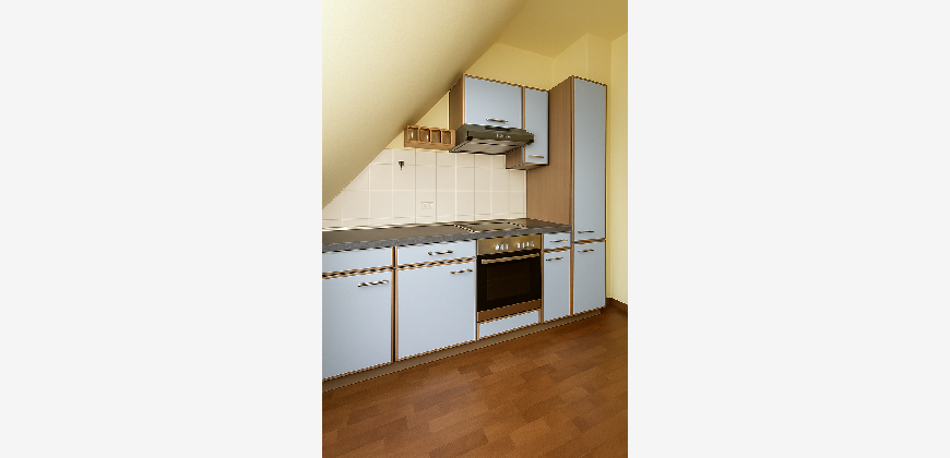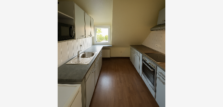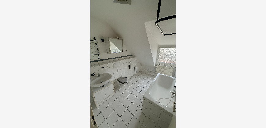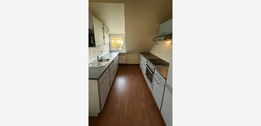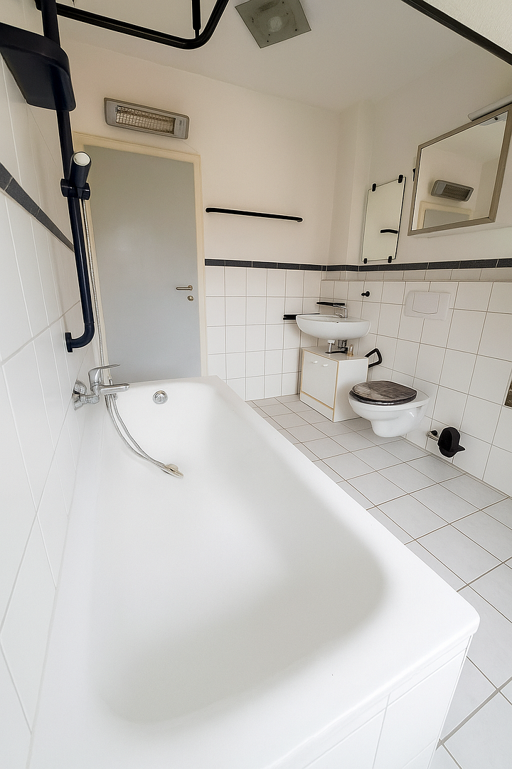 Alle Böden sind mit Laminat belegt. Im Badezimmer gibt es schöne weiße Fliesen, eine Badewanne und einen Waschmaschinen-Anschluss. Die Küche ist voll ausgestattet mit Kochherd mit Abzugshaube, Backofen, einem Kühlschrank mit Eisfach, einer Mikrowelle und einem Geschirrspüler.