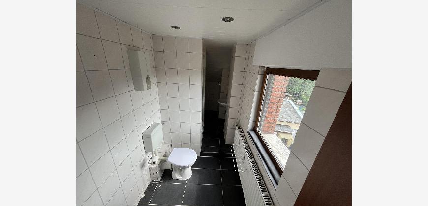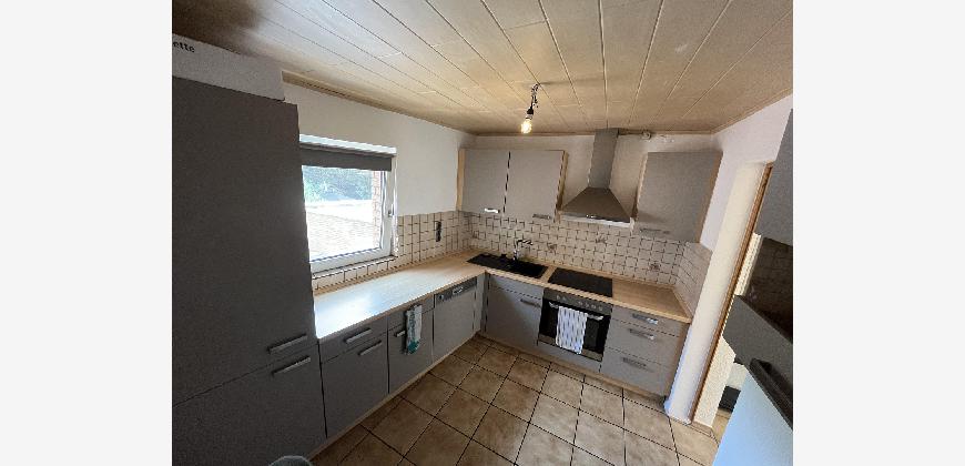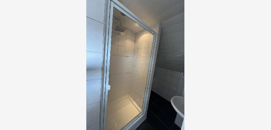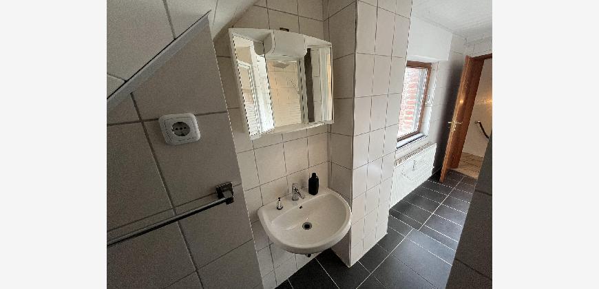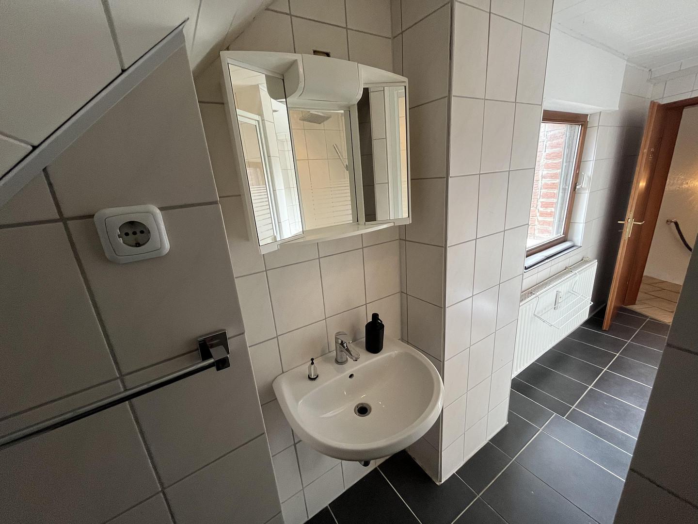 Das Bad ist mit einer Duschkabine und modernen Fliesen ausgestattet. Die stilvolle Einbauküche wird mitvermietet.