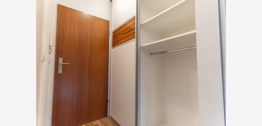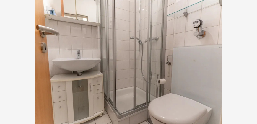Beim Betreten der Wohnung empfängt Sie ein freundlicher Dielenbereich. Ein fest eingebauter Einbauschrank bietet hier praktischen Stauraum und kann ideal als Garderobe genutzt werden. Direkt rechts befindet sich das hell geflieste Badezimmer mit einer Dusche.