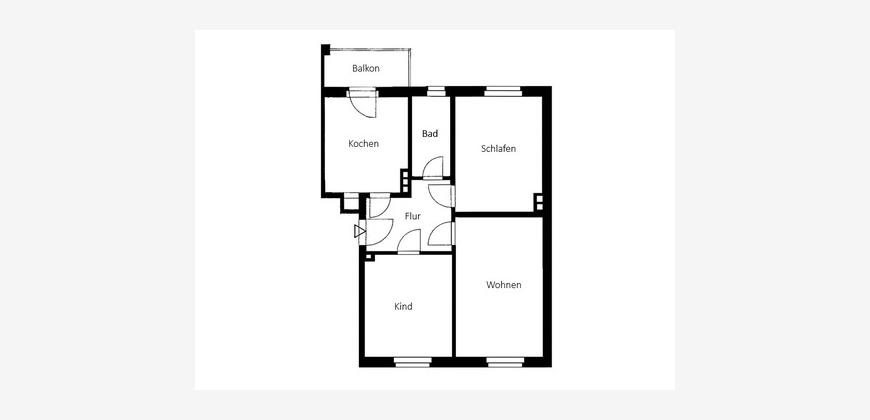 Auf einer Wohnfläche von ca. 77 m² erwartet Sie ein helles Wohnzimmer, eine separate Küche mit Zugang zum Balkon, ein ruhig gelegenes Schlafzimmer sowie ein Kinderzimmer.