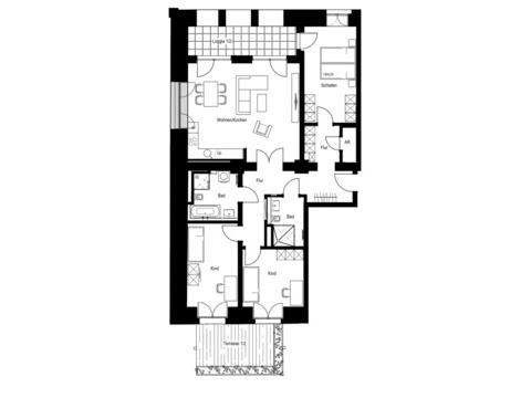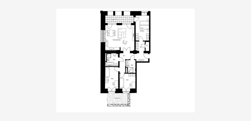 Ein große Terrasse sowie eine Loggia laden zum Entspannen im Freien ein. Zusätzlich stehen ein Gemeinschaftshof und ein Spielplatz zur Verfügung, die sich gut für Familien oder als Rückzugsort im Freien eignen.