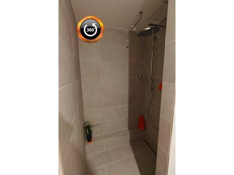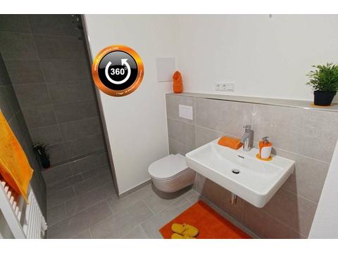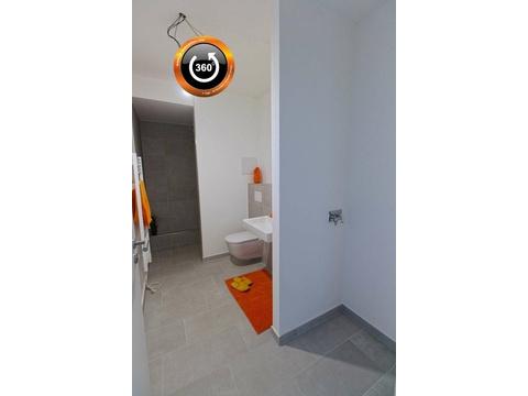 - Duschbad mit Walk-in Dusche, Rainshower-Duschkopf, XL-Feinsteinzeug-Fliesen, Anschluss für Waschmaschine