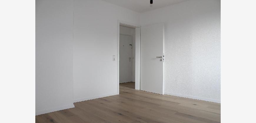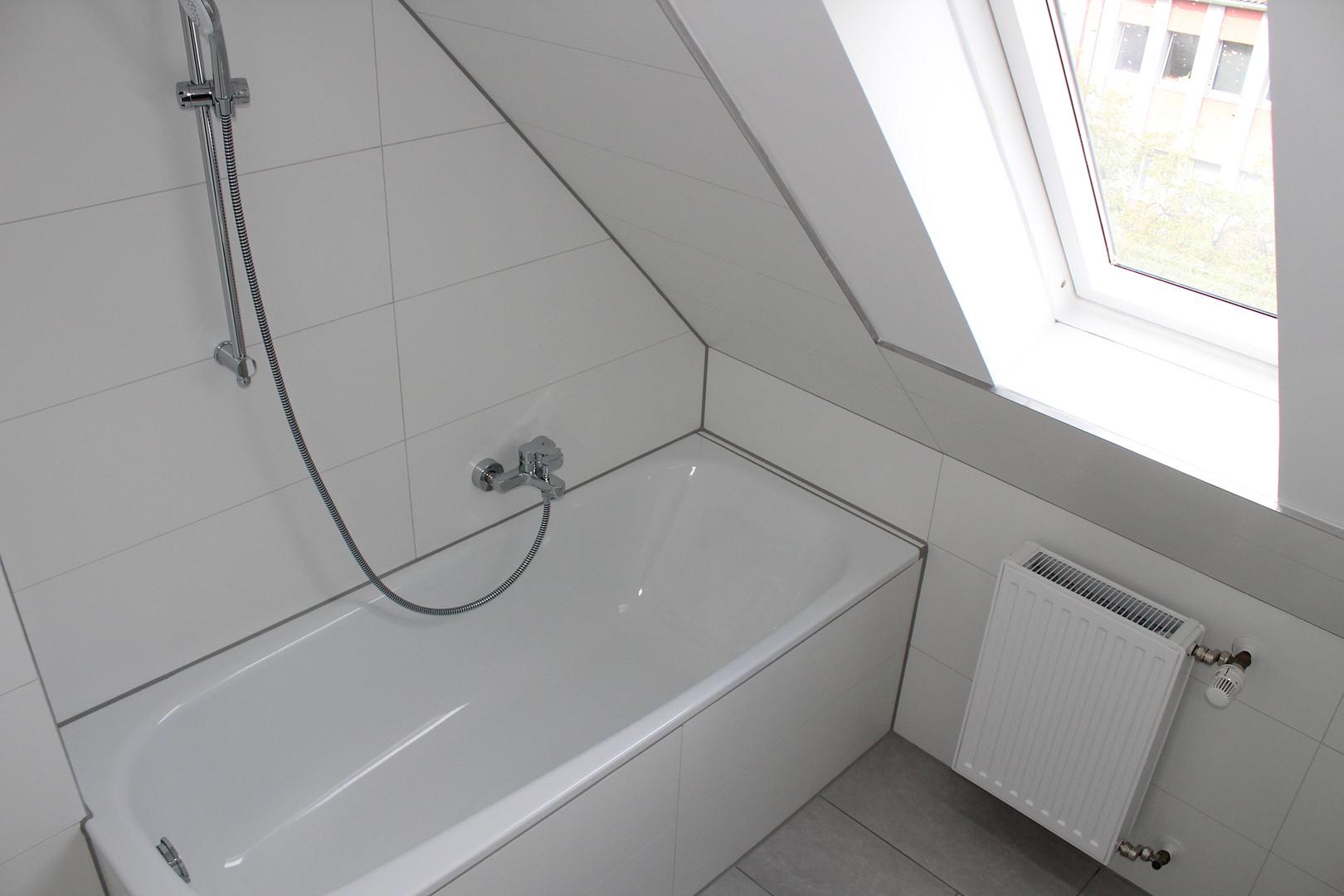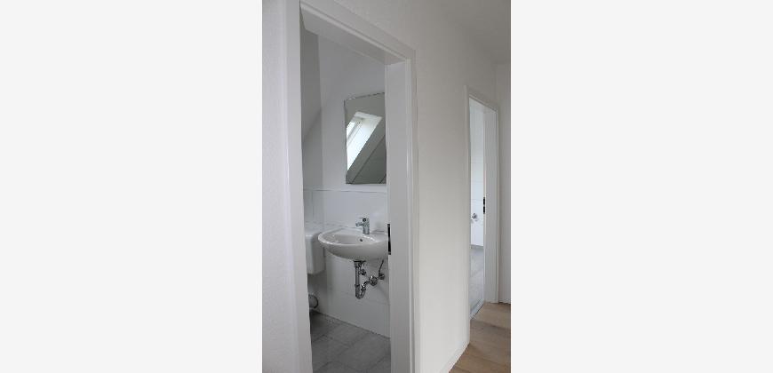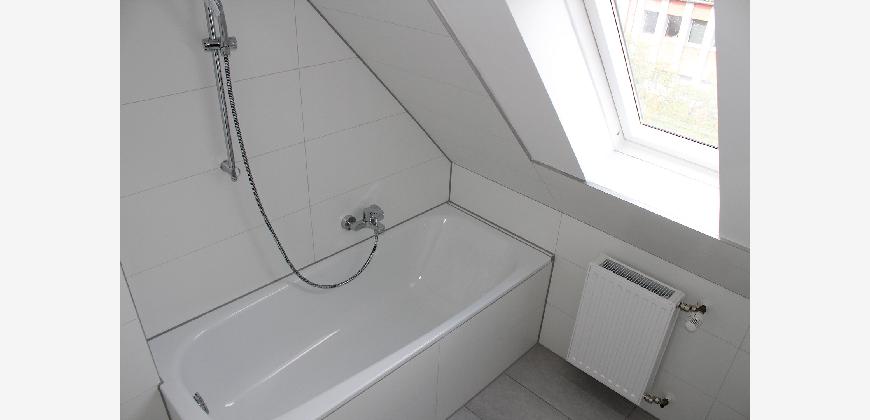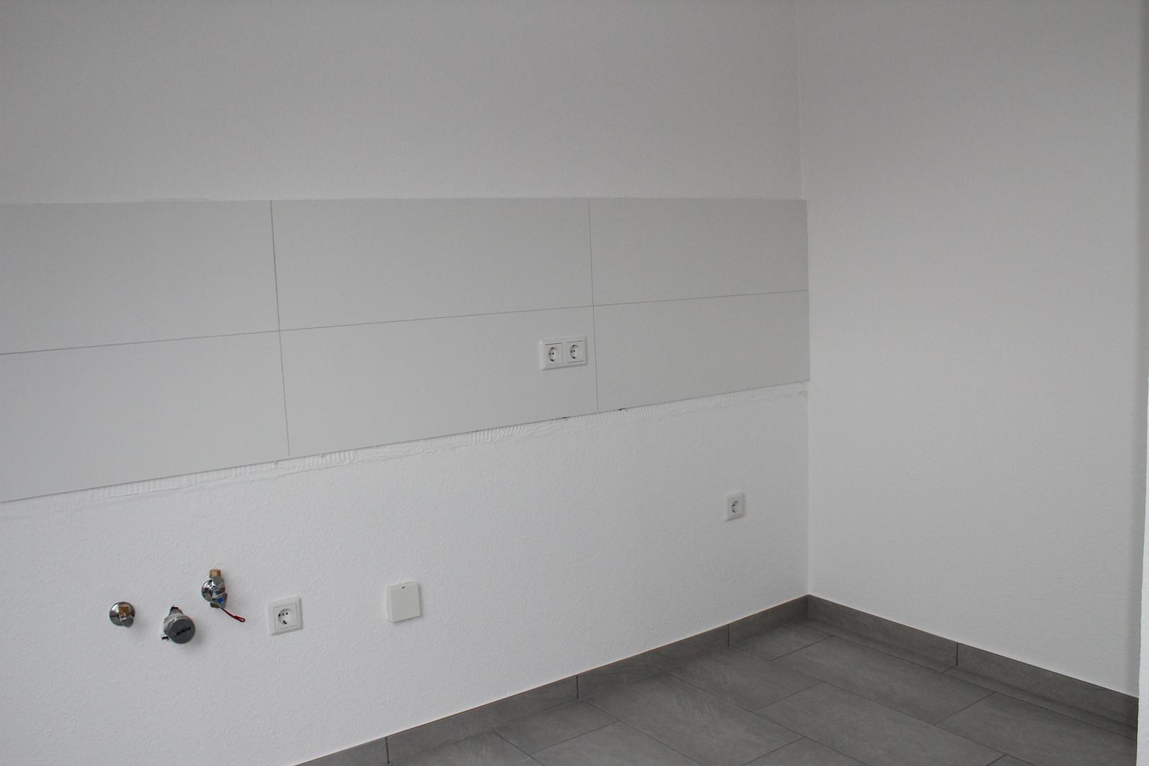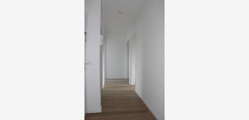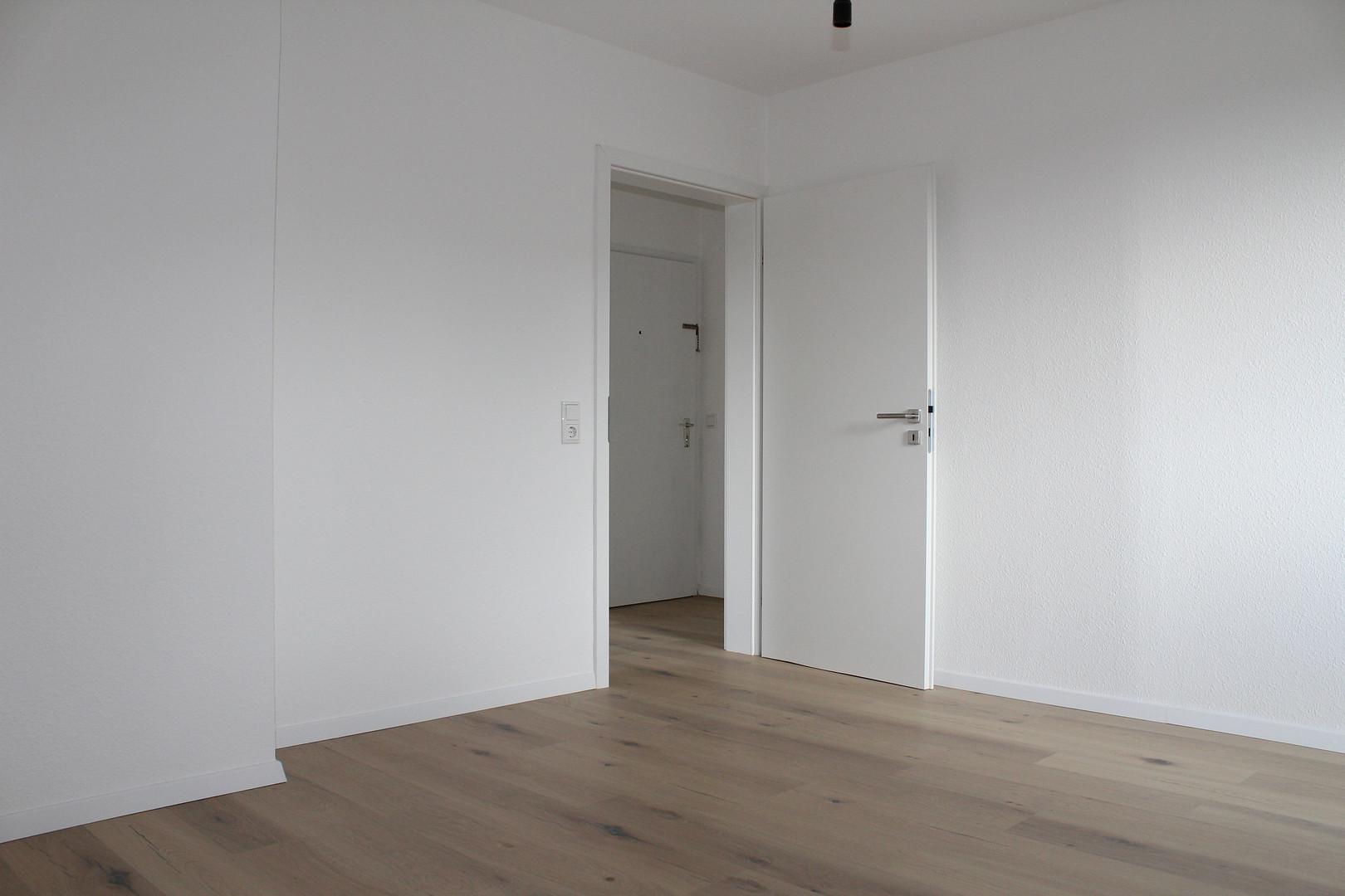 In der gesamten Wohnung wurde helles Laminat verlegt; ausschließlich im Bad ist der Boden gefliest.