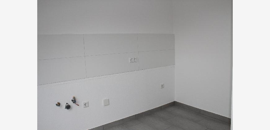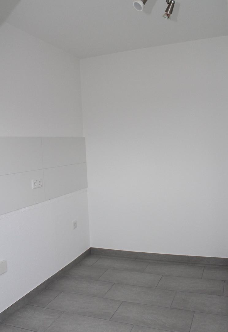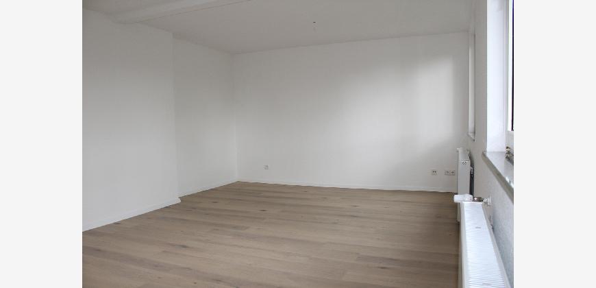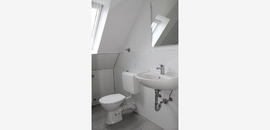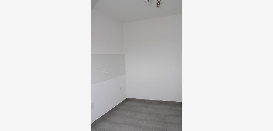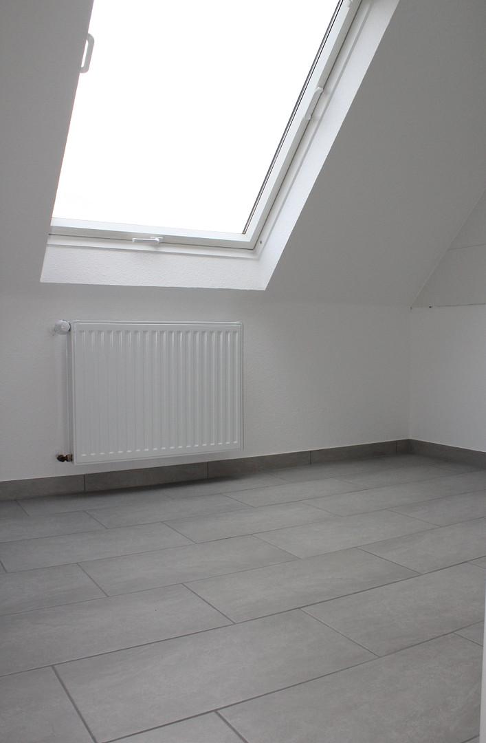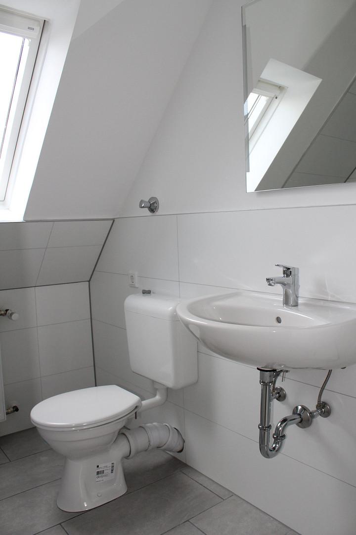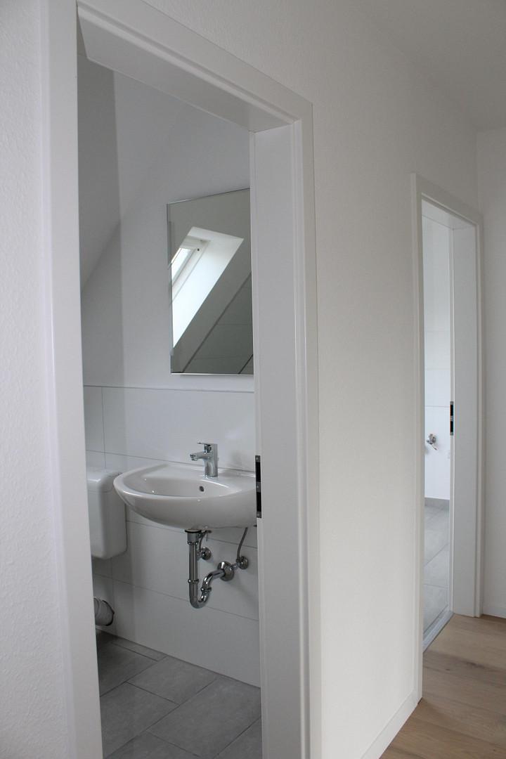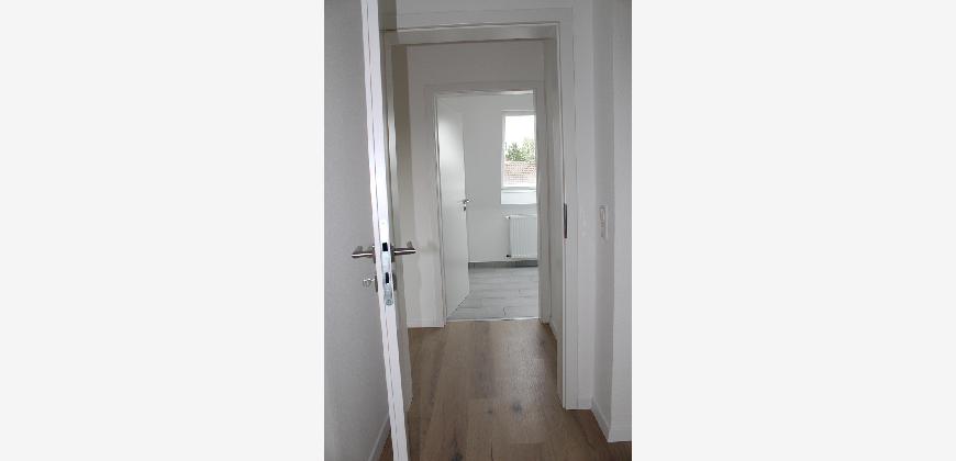 In der gesamten Wohnung wurde helles Laminat verlegt; ausschließlich im Bad ist der Boden gefliest.