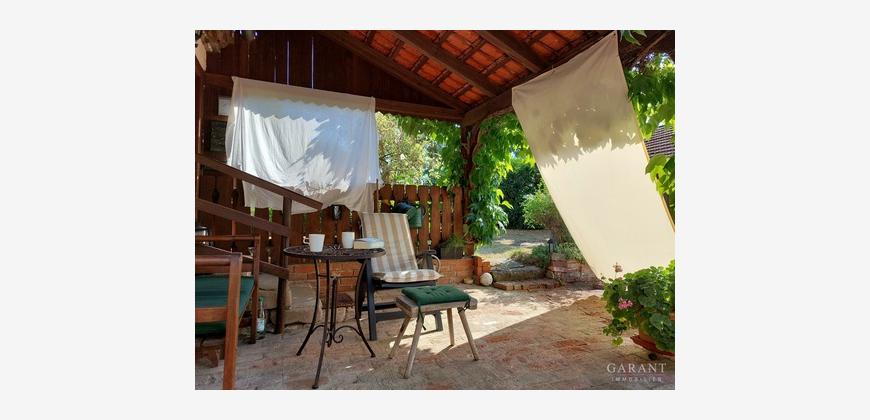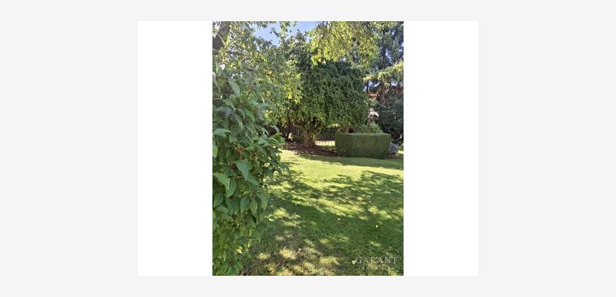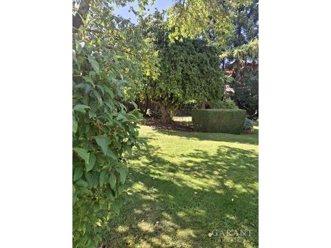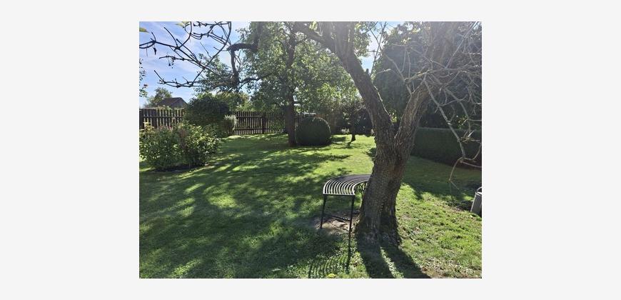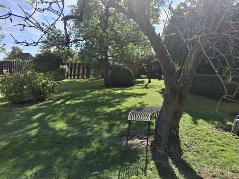 Ein entzückender Garten, liebevoll angelegt, zeigt sich mit altem Baumbestand und Rosen,
