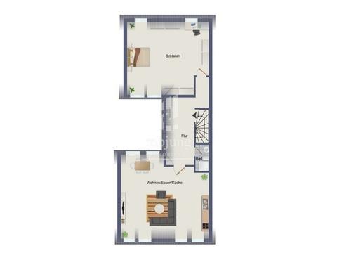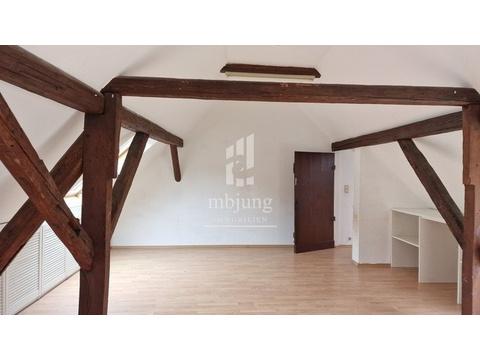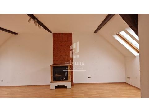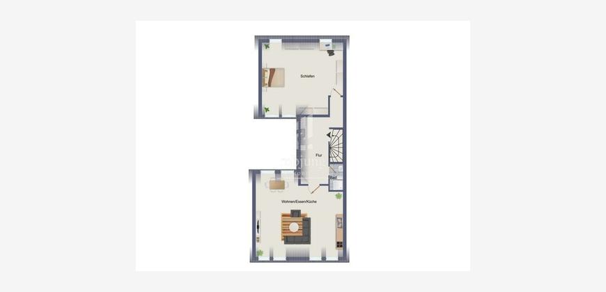 Wohnzimmer mit offener Küche und Zugang zum ausgebautem Spitzboden, Schlafzimmer, Bad, Flur