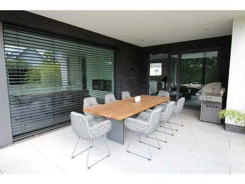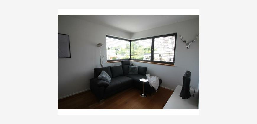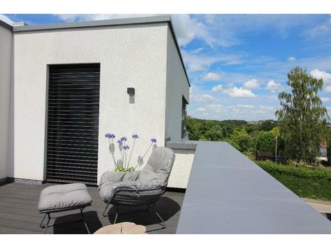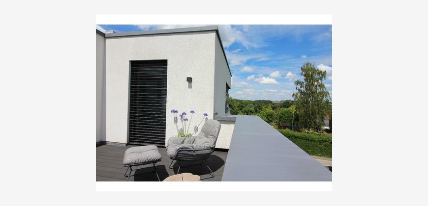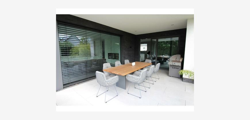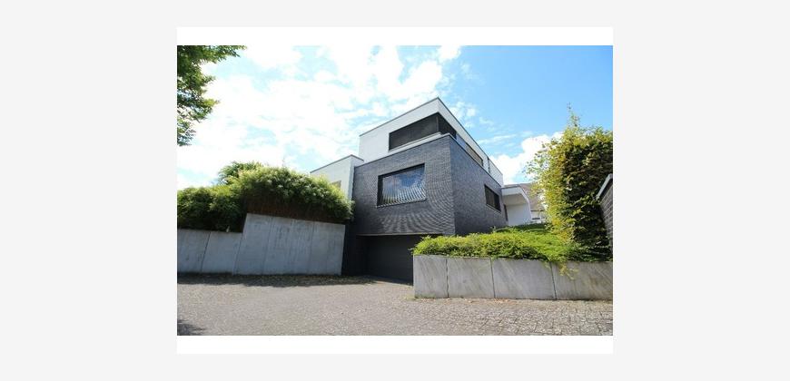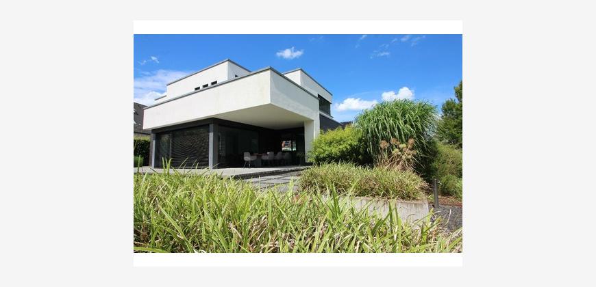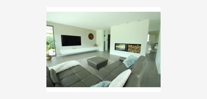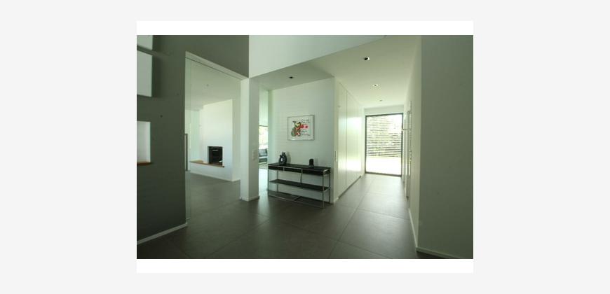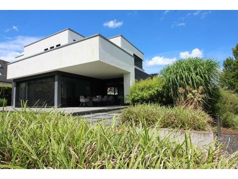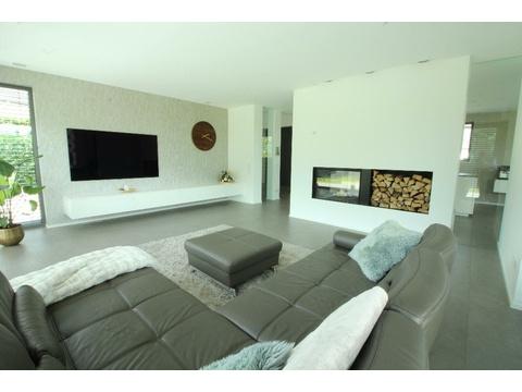Entdecken Sie diese aussergewöhnliche Designer-Villa mit fünf Zimmern mit 193 qm Wohnfläche über zwei Etagen. Dazu lädt sie ein einmalig schöner Garten mit verschiedenen Sitz-Zonen und Weitblick ein. Rasen, Gräser, Bäume und die akkurat geschnittenen Hecken wirken nicht überladen und gleichzeitig prächtig. Ein kleiner Teich im modernen Stil befindet sich neben der Terrasse. Diese ist auf einer Ecke, zur Südseite hin, überdacht, was sich als perfekter Outdoor-Dinnerplatz an warmen, regnerischen Tagen erweist.