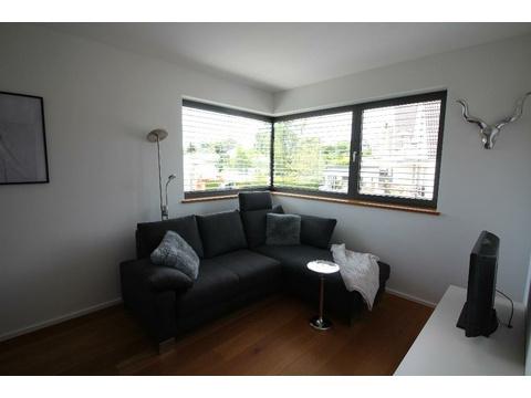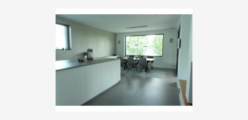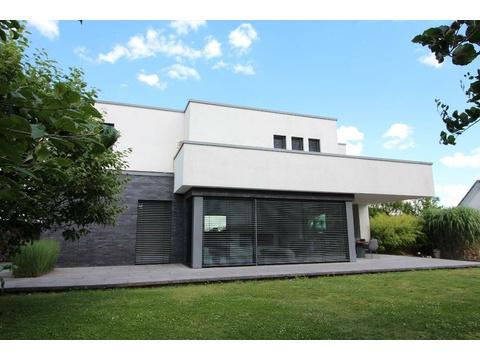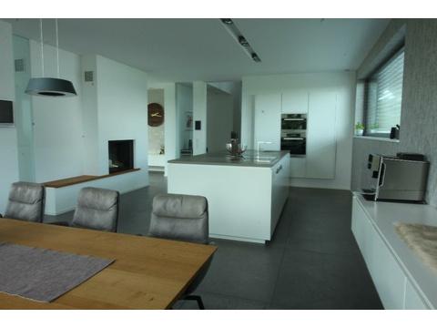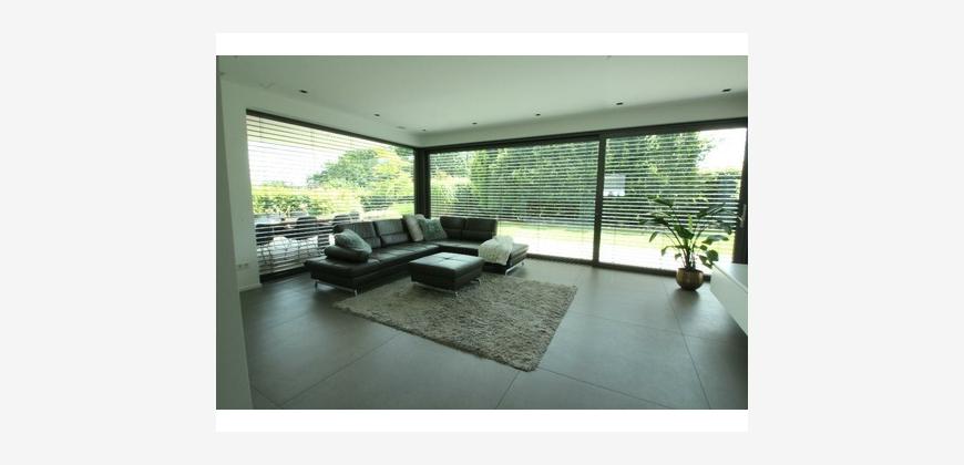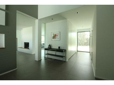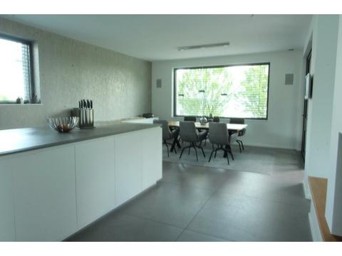 Boden: hochwertige Bodenfliesen, Betonoptik zum Obergeschoss, Aluminiumfenster 3-fach Verglasung, Warema-Beschattungsanlage W-LAN fähig.