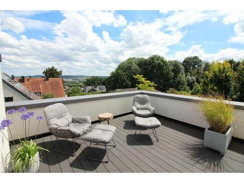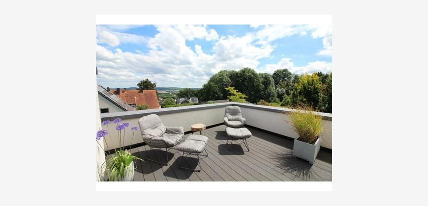 Vier Zimmer, wobei das mittlere als Ankleide benutzt wird. Hier befindet sich auch die Technik der Fußbodenheizung für das OG. Das Hauptschlafzimmer zeigt sich mit einer großen Loggia auf fast 16 qm Terrassenfläche nach Süden mit herrlicher Aussicht. Im Masterbad finden Sie Ihren persönlichen Wellnessbereich mit highlights wie Dornbracht-Regenbrause in der Walk-in Dusche, eine große tiefliegende Wanne, ein zimmerbreiter Duo-Waschtisch in Eiche eingefasst, edle Armaturen und satinierten Glastüren, alles in dezentem Erdfarbtönen gehalten.