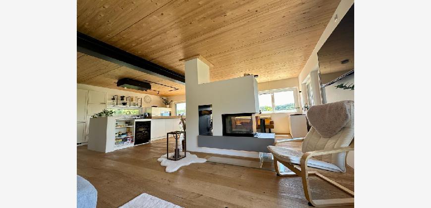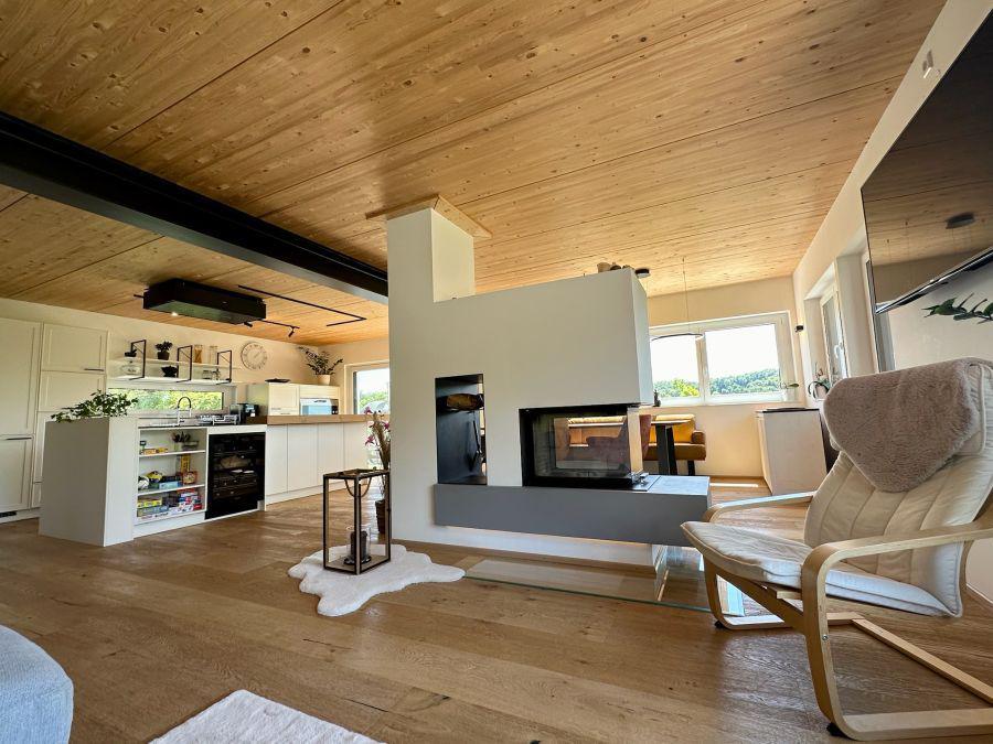 Die offene Architektur mit lichtdurchfluteten Räumen, Eichenparkett und einem beidseitigen Holzkamin schafft ein stilvolles Ambiente.