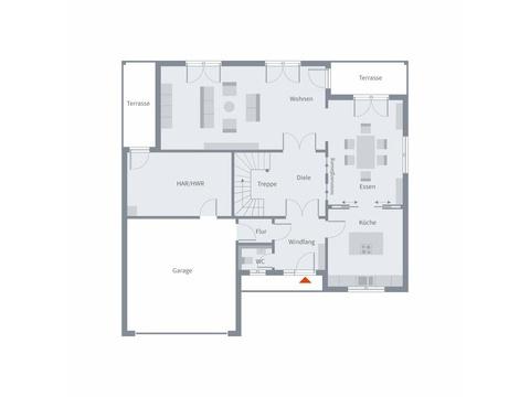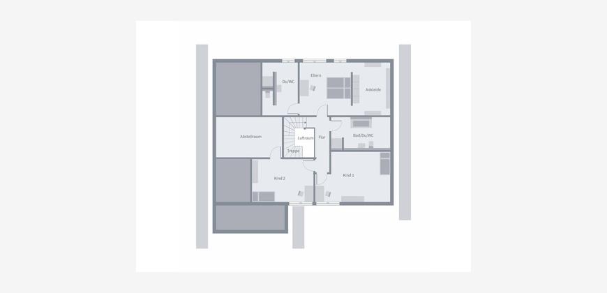 Dieses Einfamilienhaus mit seinem attraktiven Satteldach bietet viel Raum zum Entspannen und Wohlfühlen. Im Erdgeschoss lädt der lichtdurchflutete Wohnbereich, der fast 40 m² groß ist, dazu ein, in behaglicher Atmosphäre Zeit zu verbringen und direkt auf die Terrasse zu gelangen. In der separaten Küche können kreative Köche ungestört köstliche Gerichte zubereiten, die im einladenden Esszimmer genossen werden. Der große Hauswirtschaftsraum bietet einen direkten Zugang zur Garage mit zwei Stellplätzen. Neben dem Eingangsbereich befindet sich ein kleines Gäste-WC, und eine zentral gelegene Treppe führt ins Dachgeschoss. Dort erwartet Sie ein großzügiges Schlafzimmer mit separatem Bad, das über Dusche und WC verfügt, sowie einer Ankleide und dem Zugang zur Dachterrasse - alles, was für individuelles Wohlbefinden erforderlich ist. Zwei geräumige Kinderzimmer, ein zusätzliches Bad mit Badewanne, Dusche und WC sowie ein Abstellraum vervollständigen den Landhausstil im oberen Stockwerk.