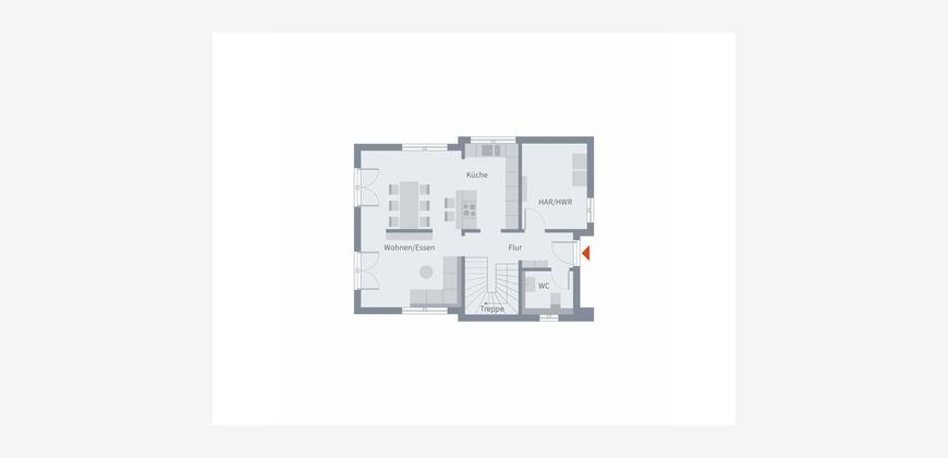 Im Erdgeschoss öffnet sich der lichtdurchflutete Wohn-, Ess- und Kochbereich - das Herz des Familienlebens. Hier spielt sich der Alltag ab: gemeinsames Kochen, lange Gespräche am Esstisch, Spielenachmittage oder ruhige Abende auf dem Sofa. Durch die großen Fenster verschmilzt das Innere mit dem Garten - drinnen und draußen werden eins. Praktische Details wie ein Hauswirtschaftsraum und ein Gäste-WC machen den Alltag leicht und unkompliziert.