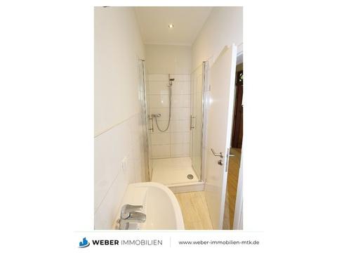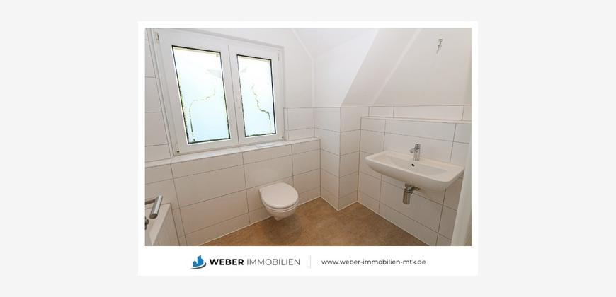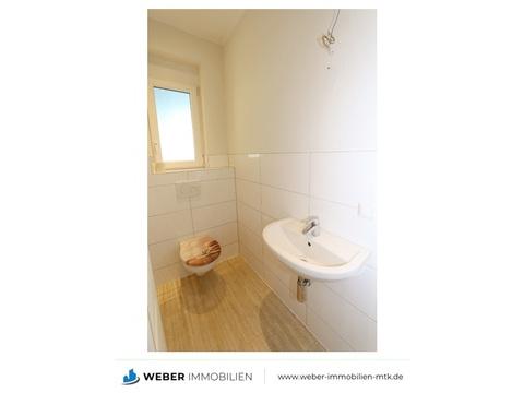 - Tageslicht-Badezimmer / Gäste WC (ca. 3,45 qm) mit WC, Waschtisch und Dusche, Laminat