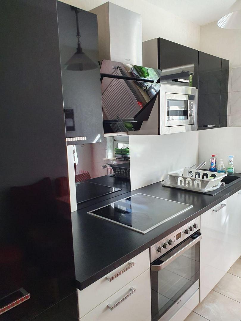 Große Wohzimmer, Exklusive Sofa mit Schlafmöglichkeit, Großer Tisch mit Stühlen, Wohnzimmerschrank, Fernseher, Bad und Sanitär, Duschbad, Handtücher vorhanden, WC, Unterhaltung und Kommunikation.