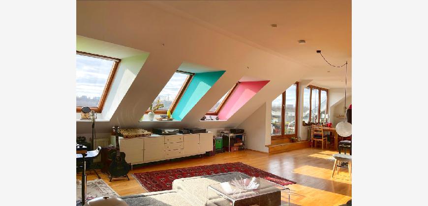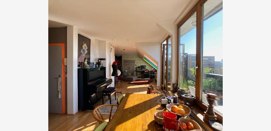 Die 2–3-Zimmer-Dachgeschosswohnung empfängt Sie mit Licht und Offenheit. Herzstück ist der rund 66 m² große, loftartige Wohn-/Ess-/Arbeitsbereich mit 12 m langer Fensterfront in klarer Nord-Süd-Ausrichtung. Die große Naturstein-Terrasse nach Süden bietet Raum für üppiges Grün und sonnige Stunden. Das nach Norden ausgerichtete Schlafzimmer öffnet sich zum grünen Innenhof und garantiert Ruhe.