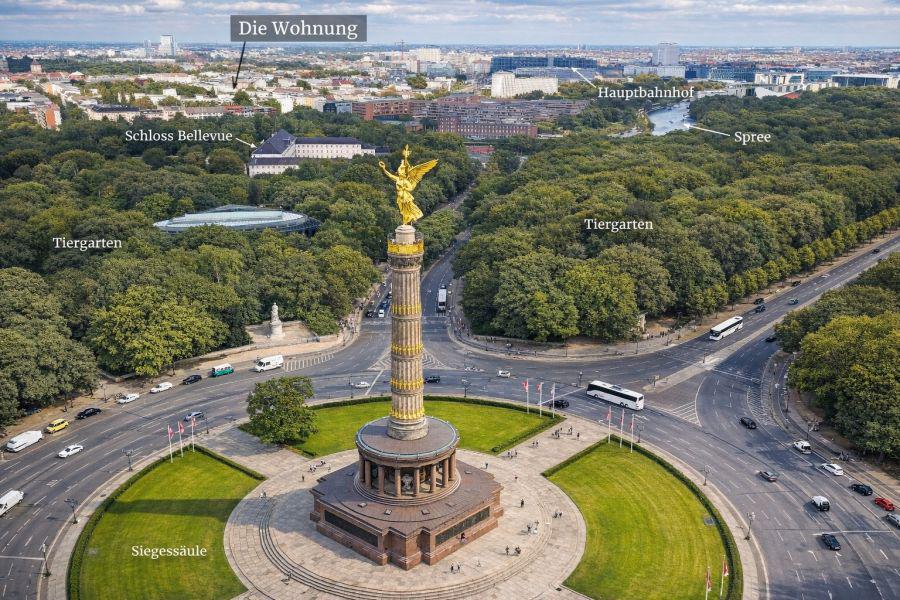 Mit nichts als Baumkronen und dem Horizont der Stadt ist diese Wohnung ein Ort zum Atmen, Wirken und Leben. Das Panorama wandelt sich mit Tageslicht, Wetter und Jahreszeiten – von der Goldelse über den Potsdamer Platz bis zum Fernsehturm. Kein Nachbar im Blickfeld, keine Wand gegenüber: Privatsphäre und Weite garantiert.