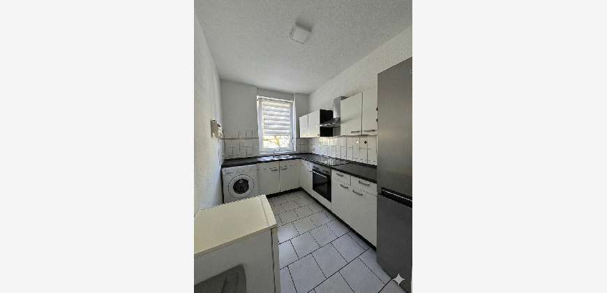 Küche: Eine funktionale Einbauküche mit ausreichend Arbeitsfläche und Platz für eine Waschmaschine ist bereits vorhanden.