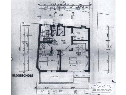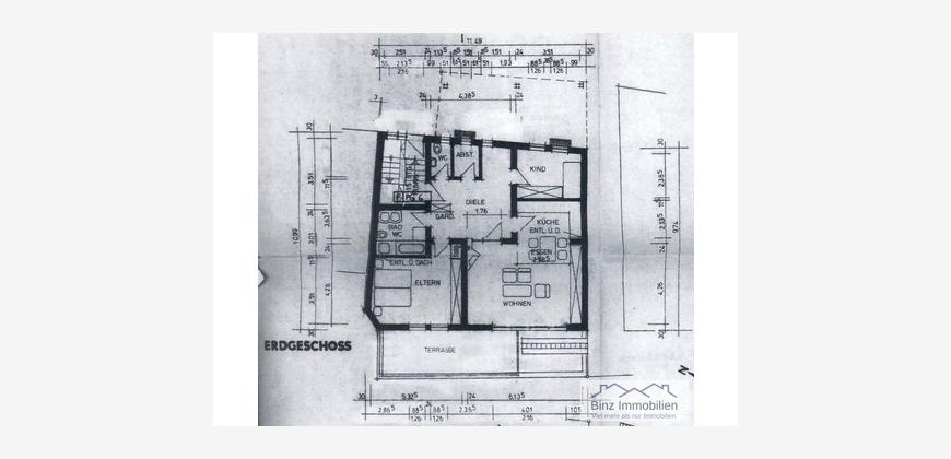 Diele, Wohn-/Esszimmer mit offener Küche, Schlafzimmer, Kinderzimmer, Bad/WC, Gäste-WC, Abstellraum, Terrasse.