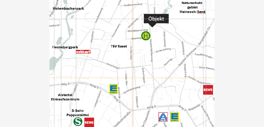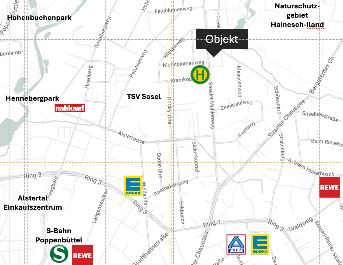 Die Wohnung befindet sich in ruhiger, grüner Wohnlage im Hamburger Stadtteil Sasel. Sasel zeichnet sich durch die gelungene Verbindung von urbaner Infrastruktur und naturnahem Wohnen aus. Der Alsterlauf mit dem Alsterwanderweg bietet in der Umgebung attraktive Möglichkeiten für Spaziergänge, Jogging- und Radtouren. Einkaufsmöglichkeiten für den täglichen Bedarf sowie weitere Geschäfte befinden sich im Ortskern rund um den Saseler Markt, auf dem donnerstags und samstags Wochenmarkt stattfindet. Über die Haltestelle Schönsberg besteht eine gute Anbindung an den öffentlichen Nahverkehr, unter anderem in Richtung Alstertal-Einkaufszentrum, S Poppenbüttel und U Volksdorf. Insgesamt überzeugt die Lage durch ein gepflegtes, familienfreundliches Umfeld mit viel Grün und gleichzeitig guter Nahversorgung.