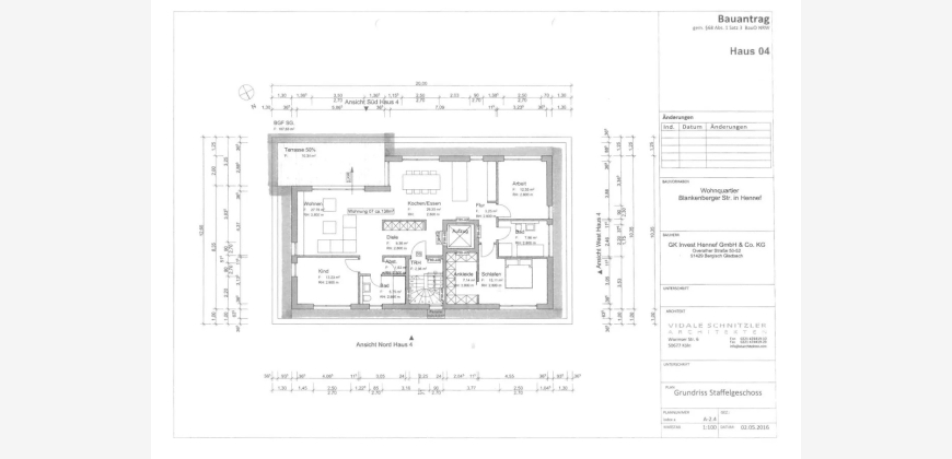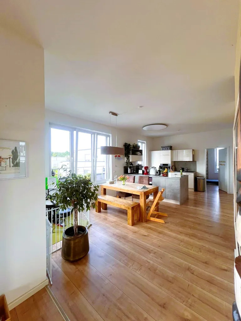 Eingangsbereich mit Diele, großzügiger Wohn-/Essbereich (ca. 54 m²) mit offener Küche und Zutritt zur Süd-Dachterrasse. Ein Schlafzimmer mit begehbarem Kleiderschrank und ein Arbeitszimmer sind vom Flur aus begehbar. Getrennt werden diese beiden Räume durch ein Bad. Dieses verfügt über ein Fenster und hat Platz für Wanne und Dusche.