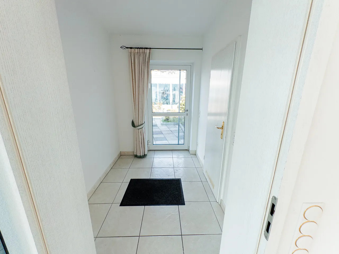 Die zum Rhein ausgerichtete Terrasse ist direkt über den Hauseingang zugänglich und bietet einen exklusiven Platz im Freien, um die Weite des Wassers zu genießen oder den Abend in entspannter Atmosphäre ausklingen zu lassen.