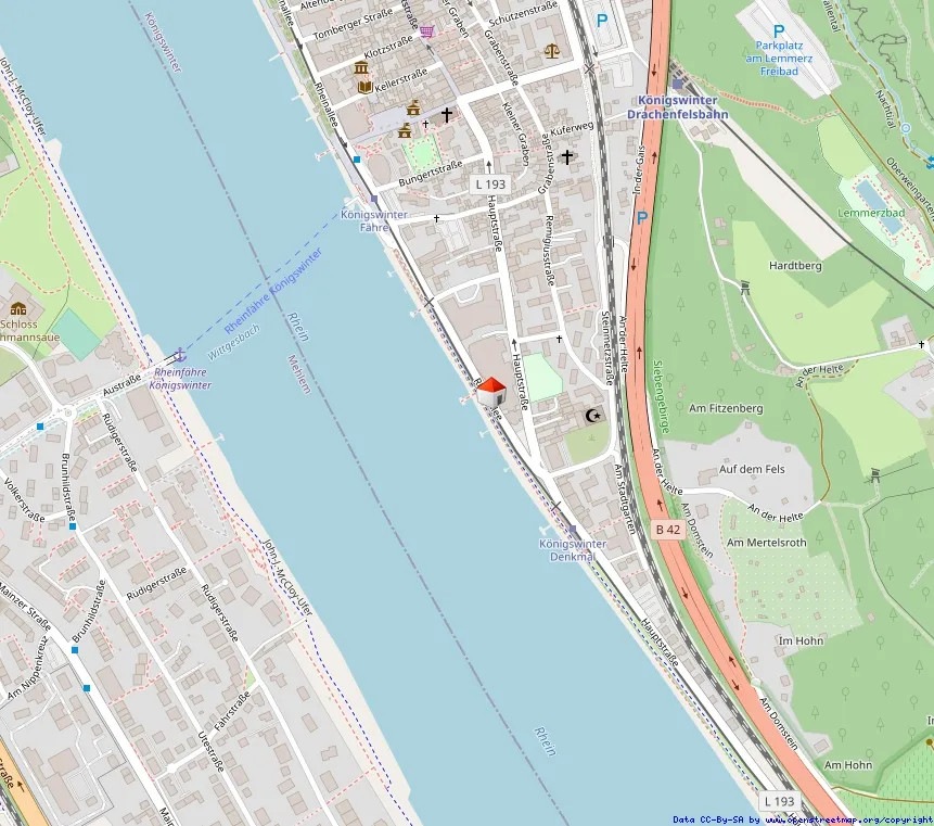 Die Rheinpromenade verläuft direkt vor dem Gebäude und bietet Möglichkeiten für Spaziergänge und Freizeitaktivitäten. Königswinter verfügt über eine gewachsene Infrastruktur mit Einkaufsmöglichkeiten, Gastronomie sowie Einrichtungen des täglichen Bedarfs.