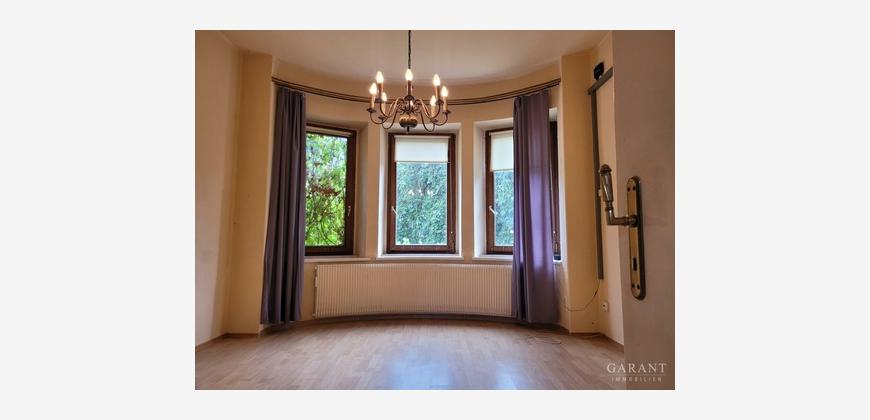 Schon der Eingangsbereich mit originaler Holztreppe vermittelt genau diese Atmosphäre. Hohe Räume, historische Details, edle Hölzer, originale Türen, vieles von dem, was heute kaum noch gebaut wird, ist hier selbstverständlich vorhanden. Ein besonderes Highlight ist das Zimmer mit Sprossen- bzw. Erkerfenstern, ein Raum mit Wirkung und Haltung.