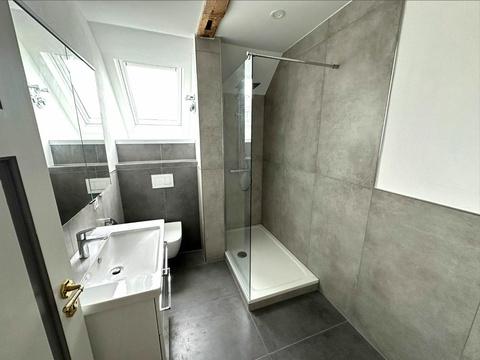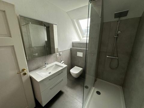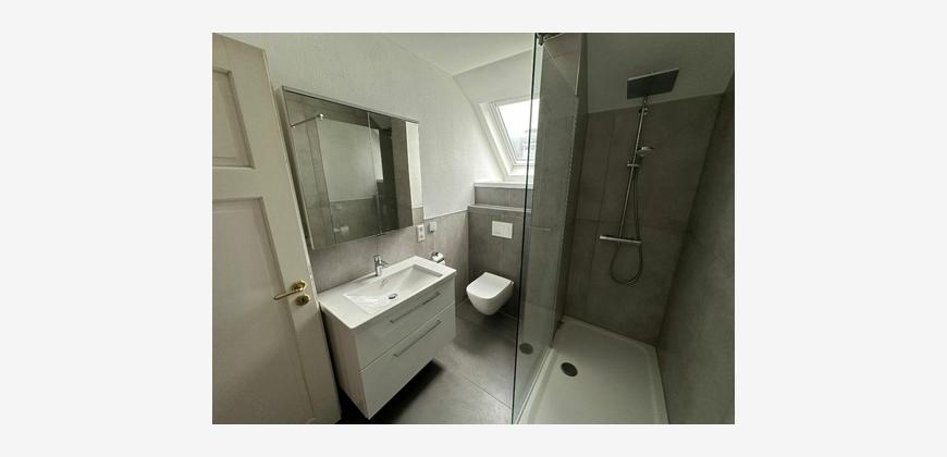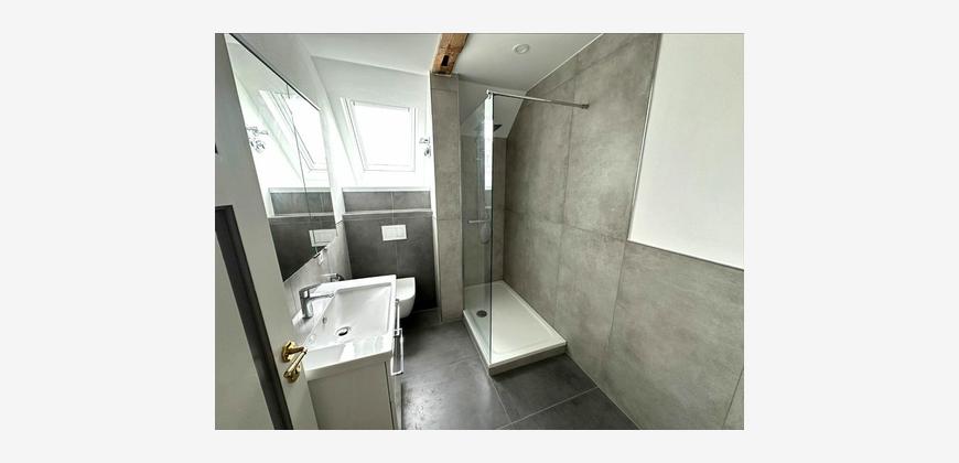 Links geht es zuerst in das komplett neu renovierte, moderne Badezimmer mit großer Dusche, Echtglasabtrennung und Fenster.
