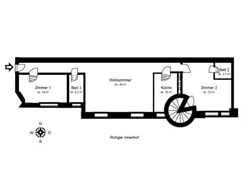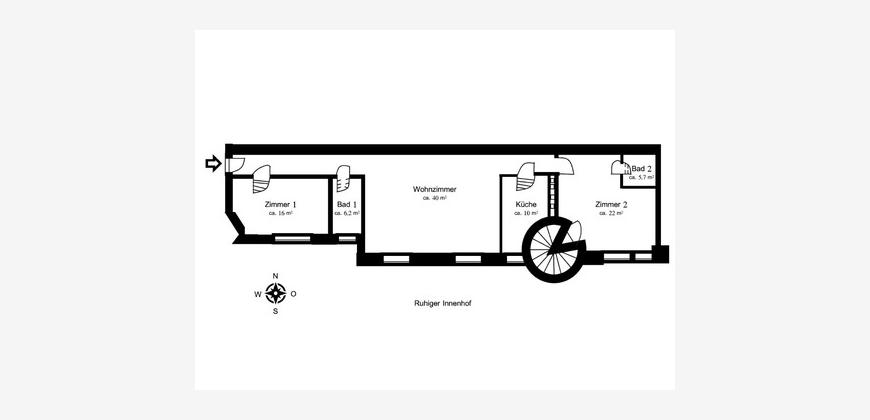 Ein charmantes Detail stellt der Zugang über den Turm mit Wendeltreppe dar, der einen alternativen Weg über ein zweites Treppenhaus ermöglicht und den Altbaucharakter nochmals hervorhebt. Zur Wohnung gehört zudem ein praktischer Kellerraum (ca. 1,50 m × 4,00 m). Der Zugang zur Wohnung erfolgt bequem über das Treppenhaus oder mittels Fahrstuhl, der eine halbe Etage oberhalb hält.
