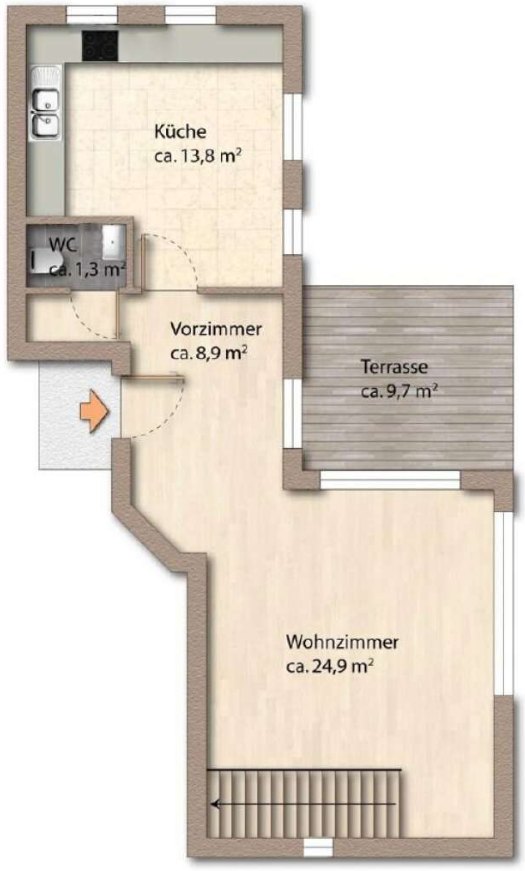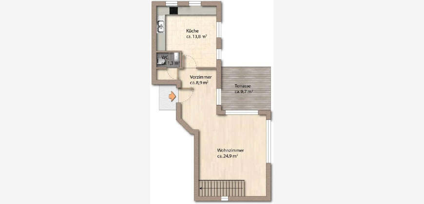 Durchdachter Grundriss: Großzügiger Wohn-/Essbereich, separate Küche, charmantes Schlafzimmer mit Schlafecke sowie zwei WCs (Gäste- & Vollbad).