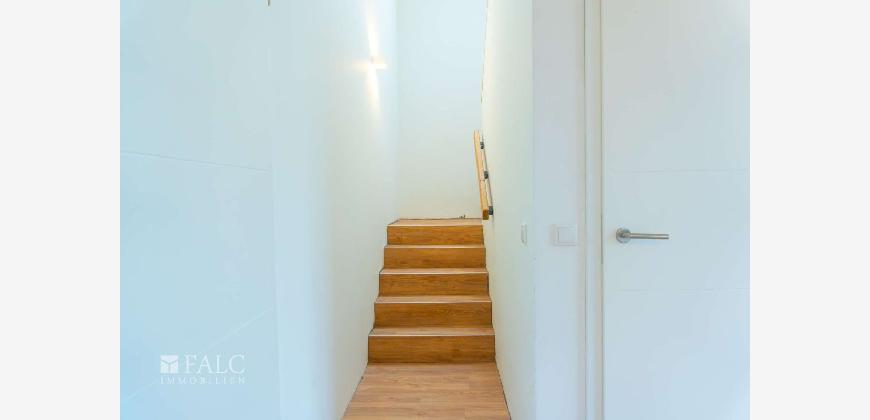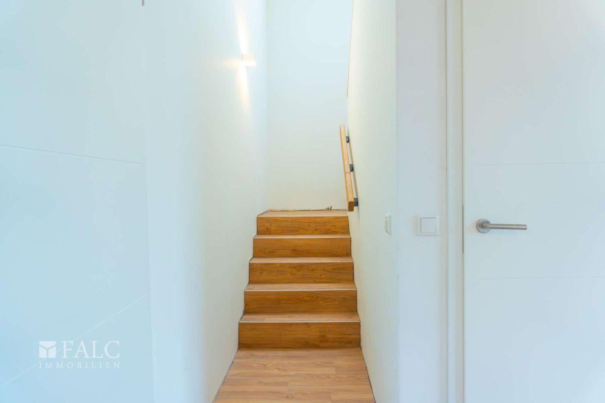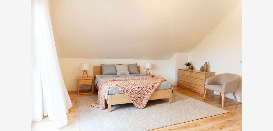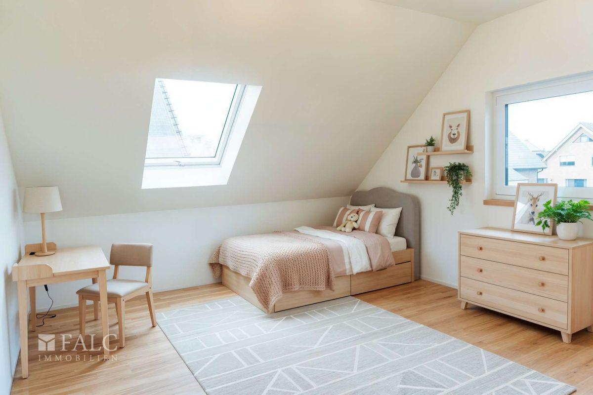 Über eine stilvolle Treppe erreichen Sie das Obergeschoss, wo sich die privaten Räume befinden. Hier erwarten Sie drei geräumige Schlafzimmer, die flexibel als Kinder-, Gäste- oder Arbeitszimmer genutzt werden können. Die Zimmer sind so gestaltet, dass sie viel natürliches Licht bieten und eine angenehme Atmosphäre schaffen.