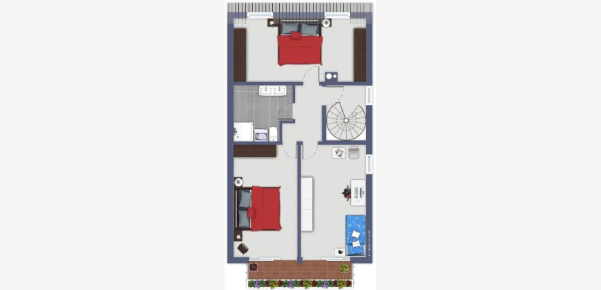 Im Obergeschoss befinden sich zwei Kinderzimmer, ein Schlafzimmer mit großen Einbauschränken und ein weiß gefliestes Bad mit Dusche.
