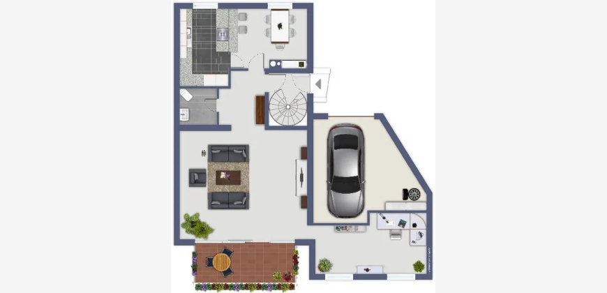 Das Erdgeschoss besteht aus einem großen Wohnzimmer mit Balkon und Kamin, einer Küche mit Essbereich, einem Gäste-WC und einem Arbeitszimmer.