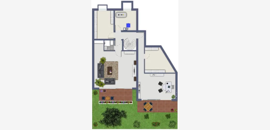 Der Garten ist über das Wohnzimmer, über eine Außentreppe und über das Kellergeschoss erreichbar.