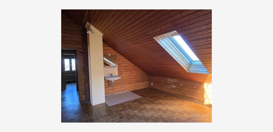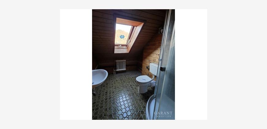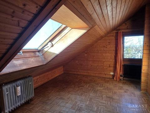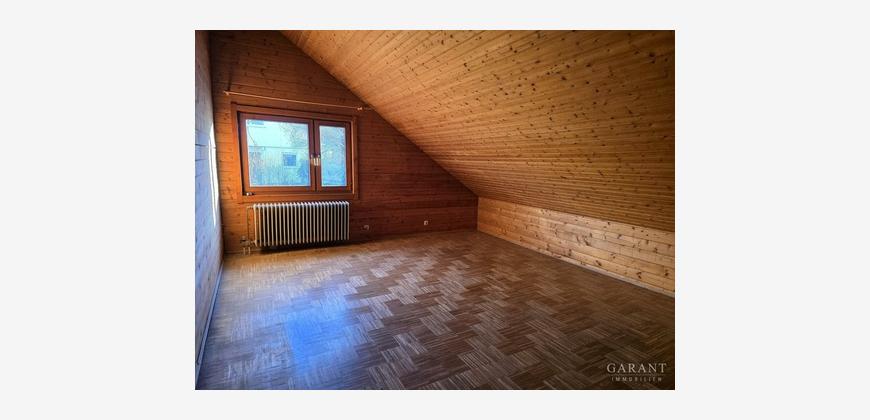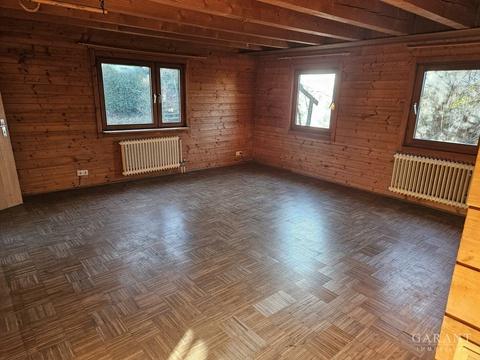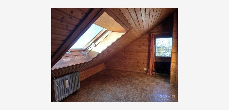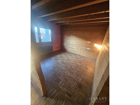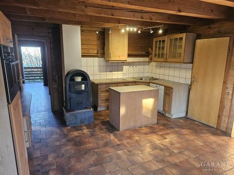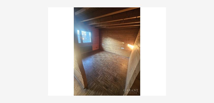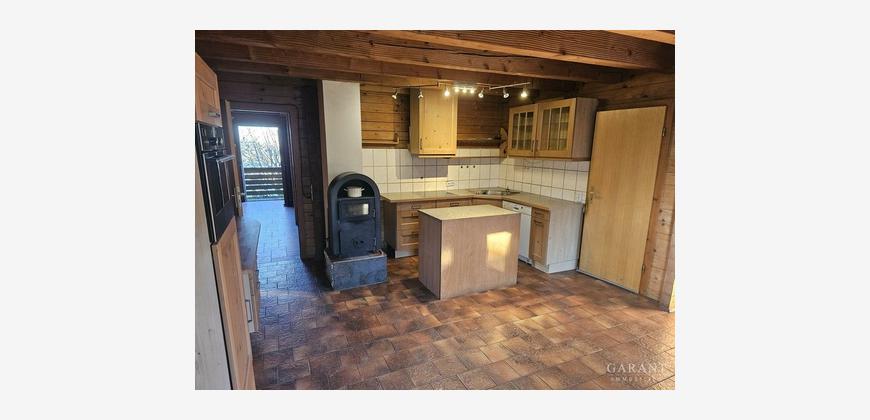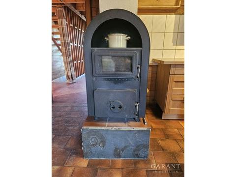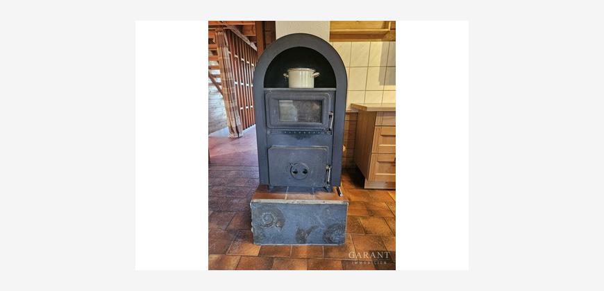 So vermitteln die durchgängigen Wandholzverschalungen, die offene Holzbalkendecke sowie die Parkettböden ein heimeliges Gefühl von Wärme. Dabei ist die geräumige Wohnküche mit dem angrenzenden Balkon und einem separaten Durchgang zum Wohnzimmer im EG der zentrale Lebensmittelpunkt des Hauses. Der hier vorhandene Kaminofen tut sein Übriges.