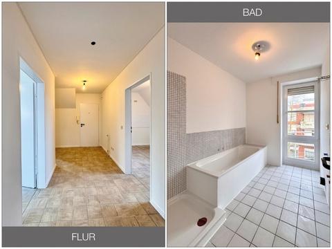 Über einen zentralen Flur sind alle Räumlichkeiten direkt erreichbar. Neben der Küche und einem funktionalen Badezimmer, das sowohl mit einer Badewanne als auch mit einer Dusche ausgestattet ist, verfügt die Wohnung über zwei Schlafzimmer. Ein zusätzlicher, eigener Abstellraum im Dachboden bietet praktischen Stauraum.