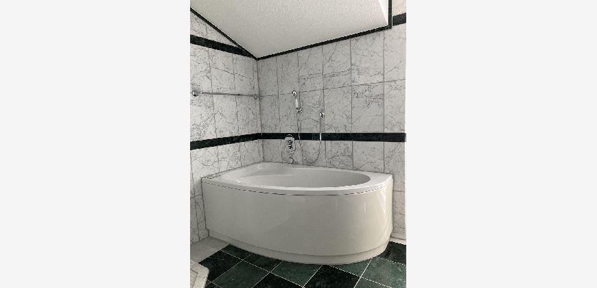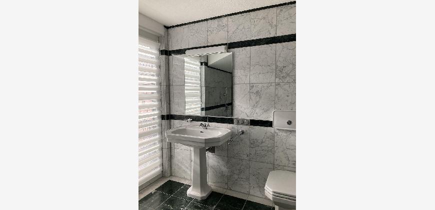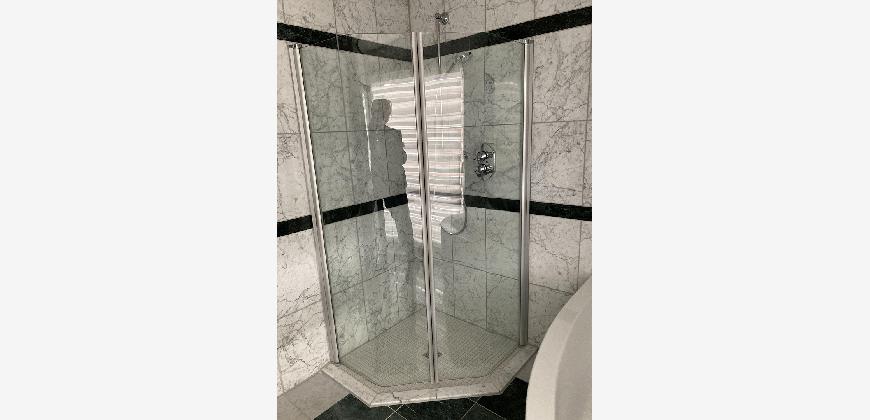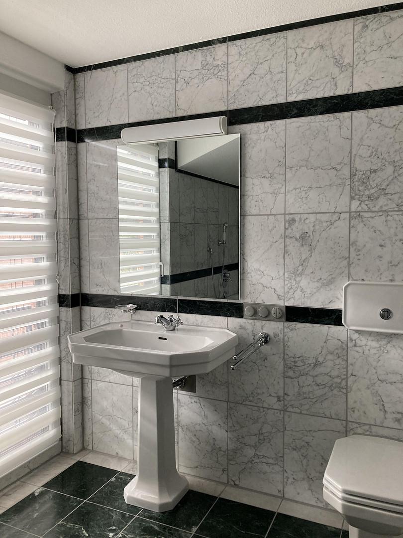 • Klassisch elegantes Marmor-Vollbad mit bodengleicher Dusche