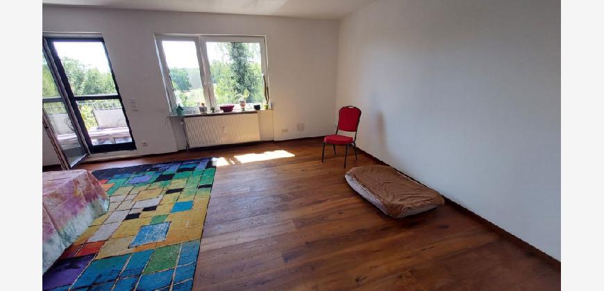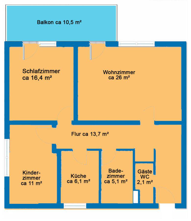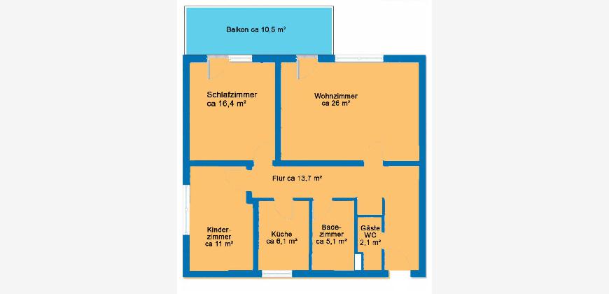 - Einen Balkon, der über Wohnzimmer und Schlafzimmer begehbar ist