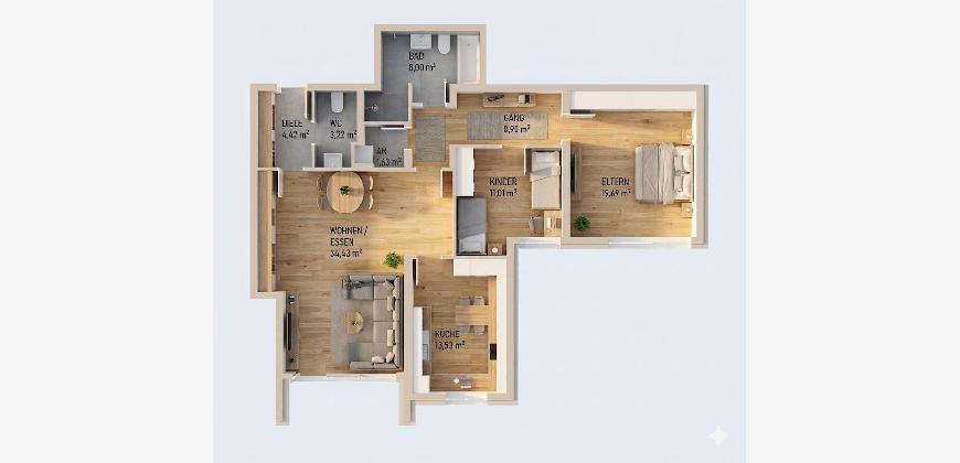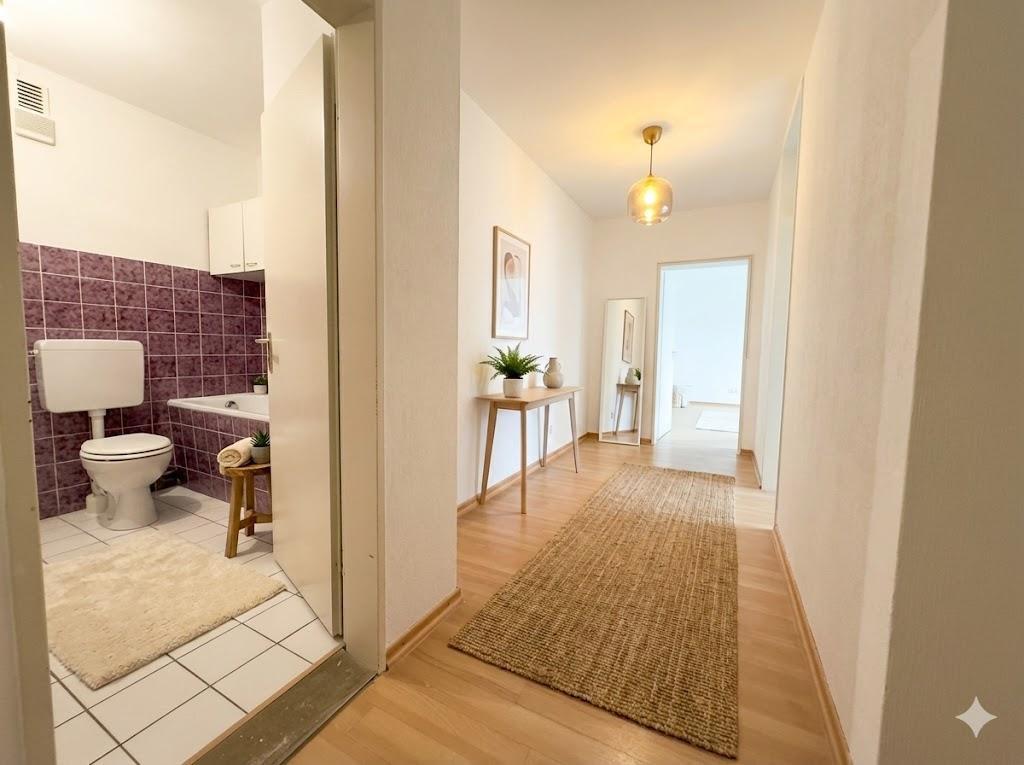 Die Wohnung ist digital möbliert und wird unmöbliert übergeben. Die gezeigten Bilder dienen ausschließlich der Inspiration zur möglichen Einrichtung; leichte Abweichungen zur tatsächlichen Wohnung sind möglich.