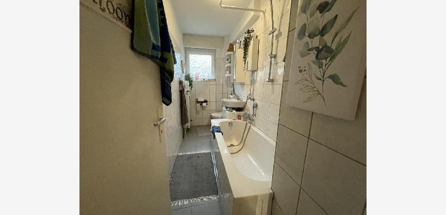 Die Wohnung verfügt über eine zeitlose und funktionale Ausstattung. Das Vollbad ist weiß gefliest und mit einer Badewanne sowie einem Fenster ausgestattet, was für eine angenehme Belichtung und Belüftung sorgt.