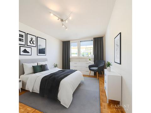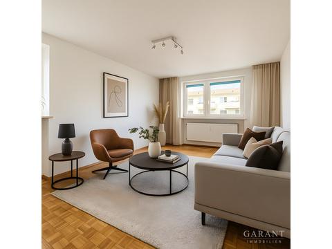 Wohn- Schlafzimmer und Balkon sind derzeit unmöbliert und wurden für die Fotos mit ausgewähltem Mobiliar und Dekoration virtuell ausgestattet, um einen wohnlichen Eindruck zu vermitteln.