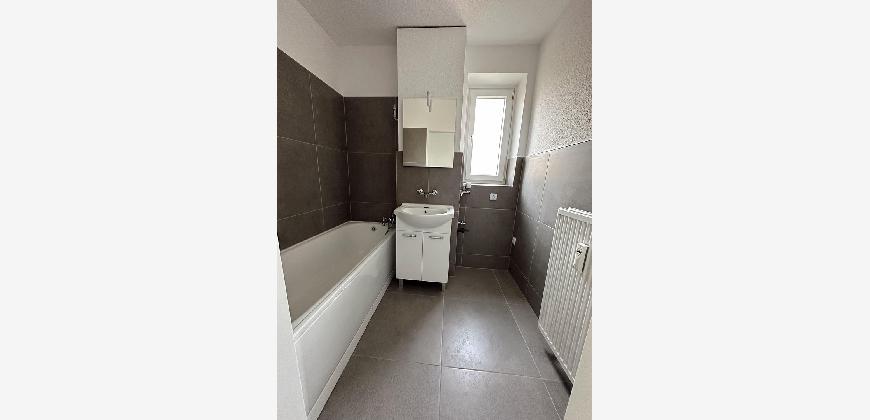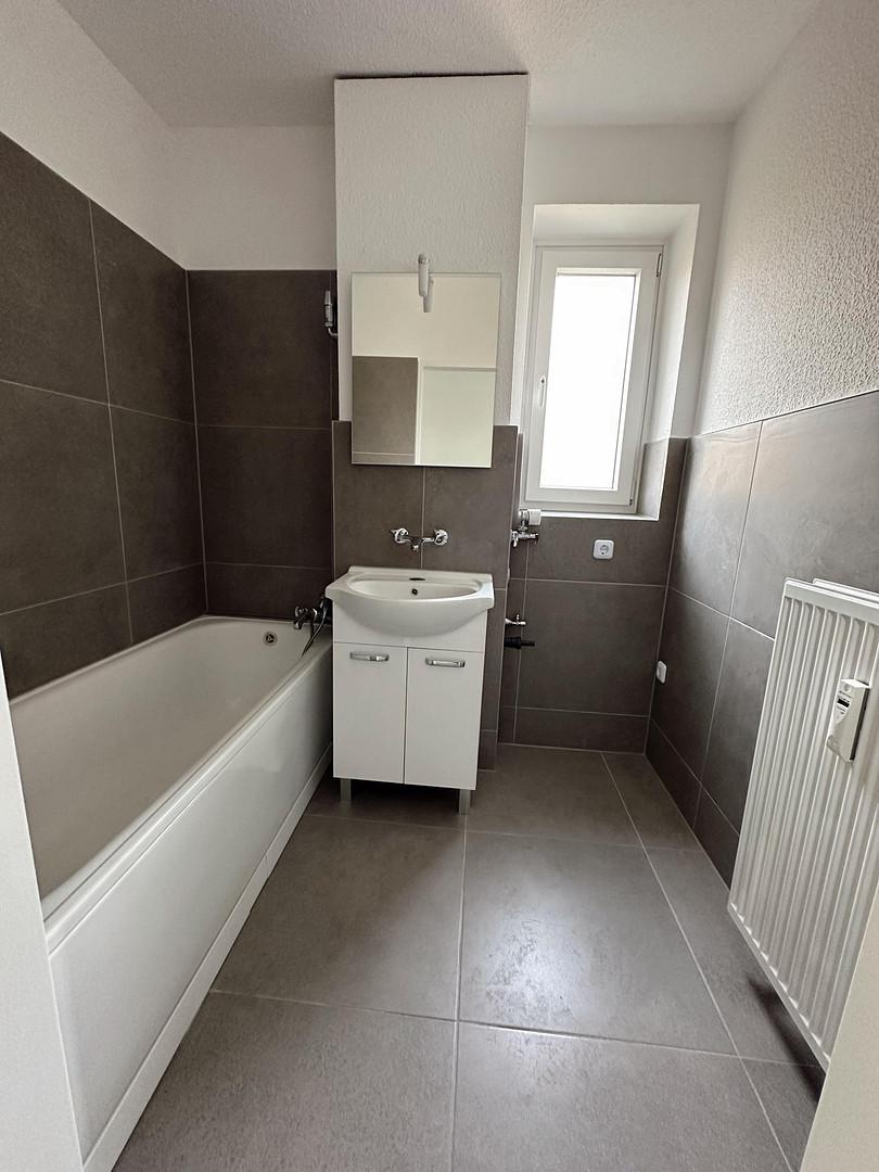 -Vollgefliestes Badezimmer mit Badewanne und Fenster