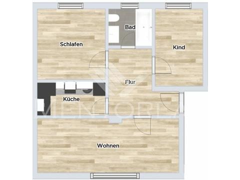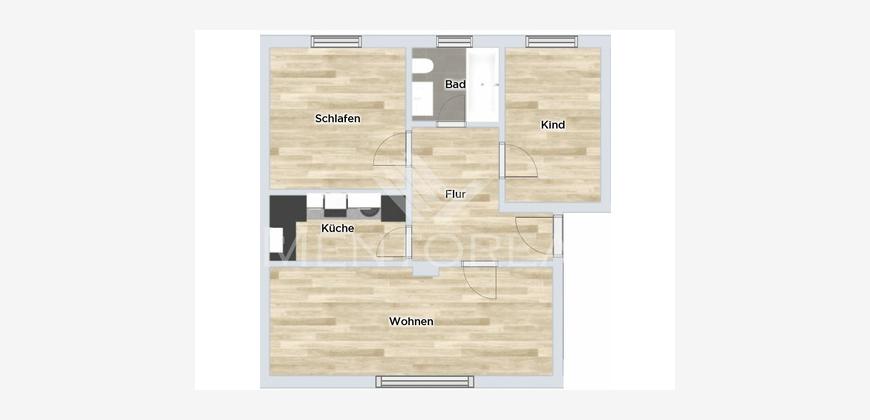 Die gut geschnittene 3-Raum-Wohnung erstreckt sich über eine Wohnfläche von ca 53 m². Über den Flur gelangt man in alle Räumlichkeiten - das Bad, die Küche, Wohnzimmer sowie die zwei Schlafzimmer. Der gut gestaltete Grundriss bietet individuelle Gestaltungsmöglichkeiten.