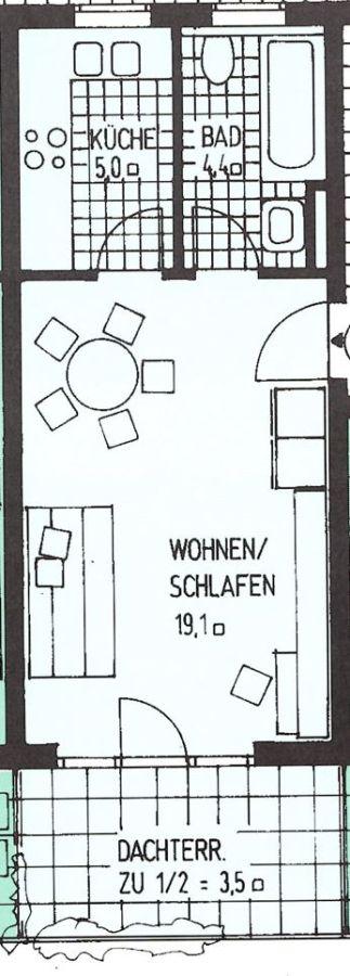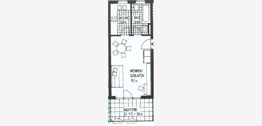 Die Wohnung befindet sich im 2. OG und bietet eine Wohnfläche von ca. 33 m². Der gut durchdachte Grundriss überzeugt mit einem hellen Wohnzimmer mit direkten Zugang zur Dachterrasse. Eine separate Küche ergänzt den guten Schnitt der Wohnung.