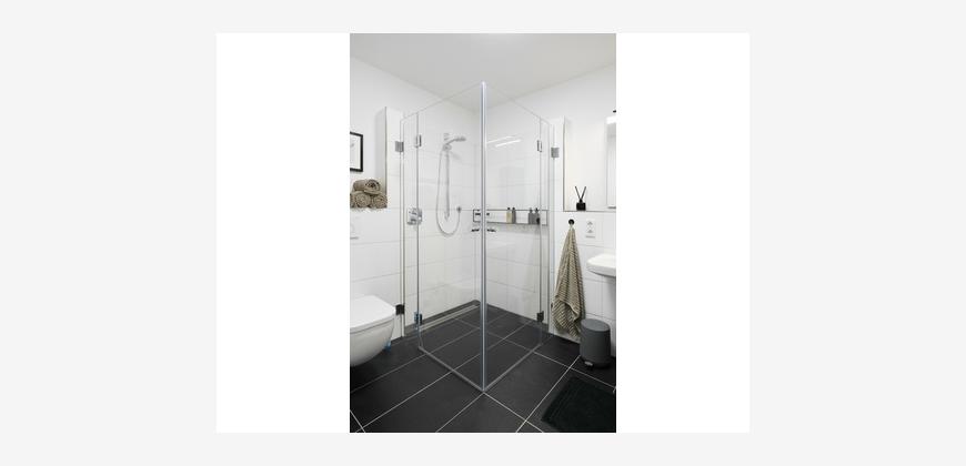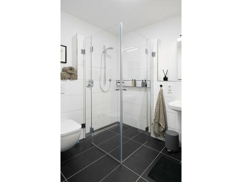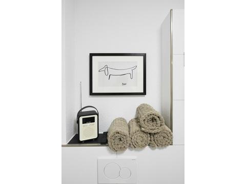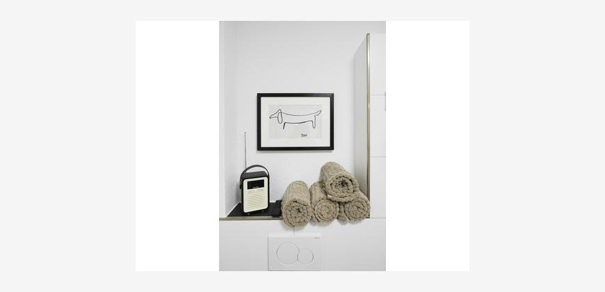 Das innenliegende Badezimmer ist mit anthrazitfarbenen Bodenfliesen, weißen Wandfliesen und einer bodentiefen Dusche mit zweiflügeliger Vollglas-Abtrennung ausgestattet. WC und Waschtisch sind ebenfalls in weiß gehalten. Das Bad wird mit Ablage in der Duschkabine, Bad-Schrank, Spiegel, Lampe, Badradio, Handtücher und Dekoration angeboten.