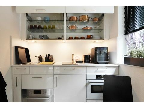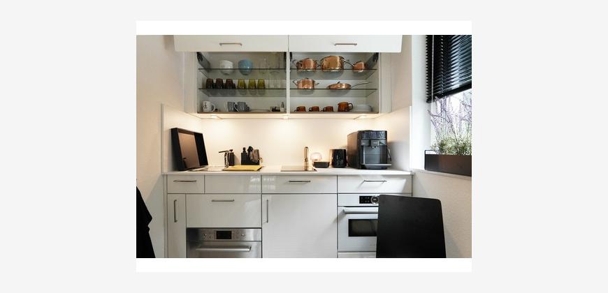 Ein weiteres Highlight ist sicherlich die Einbauküche, die voll ausgestattet angeboten wird. Weiße Fronten mit dezenten Griffen, Marken Edelstahl-Backofen und Geschirrspüler, 2-Platten Glas-Kochfeld, LED Beleuchtung, Kaffeemaschine, Wasserkocher, Toaster & Co. Dazu ein Set an hochwertigen Messing-Töpfen, Gläsern, Tassen, Tellern und Besteck. Die kleine Sitzecke mit zwei Stühlen und Tisch bietet ausreichend Platz für die täglichen Mahlzeiten.