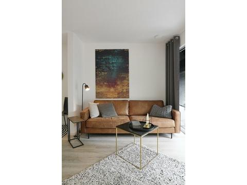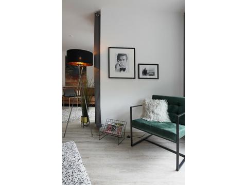 Im Wohn- und Schlafbereich finden Sie ein gemütliches King-Size Bett mit Nachttischen und Lampen vor einer neu vertäfelten Holzwand, ein einladendes Ledersofa mit Tischchen unter ansprechendem Kunstwerk, eine kleine Leseecke mit Stehlampe und Magazinständer, ein Sideboard mit Flatscreen sowie viele Bilder, geschmackvolle Dekorations-Elemente und Teppiche. Einige der Lampen sind über Funkschalter zu bedienen, so dass Sie Ihre Lichtstimmung ganz bequem in der ganzen Wohnung steuern können. Dazu finden Sie in der Wohnung eine Bluetooth-Box und einen Router für Ihr WLAN, sowie ein Bügelbrett nebst Bügeleisen..