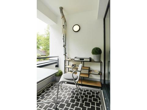 Vom Wohnzimmer aus haben Sie Zugang zur Loggia, die ebenfalls wie auf den Fotos angeboten wird. Ein kleiner Tisch mit zwei Stühlen und Teppich, ein Sonnenschirm, ein Regal für Abstellmöglichkeiten, einem Elektrogrill und gemütlicher LED-Lichterkette. Die Loggia ist südlich ausgerichtet und bietet bei allen Wetterlagen einen schönen Ort zum Genießen und Entspannen.