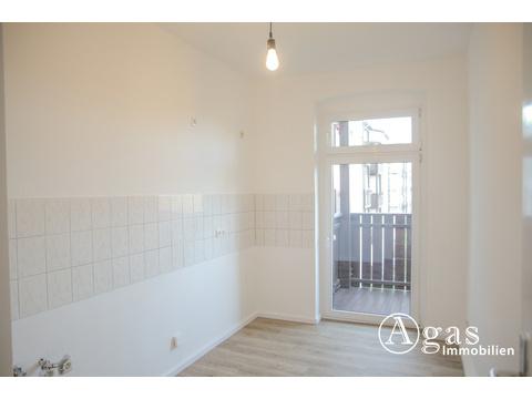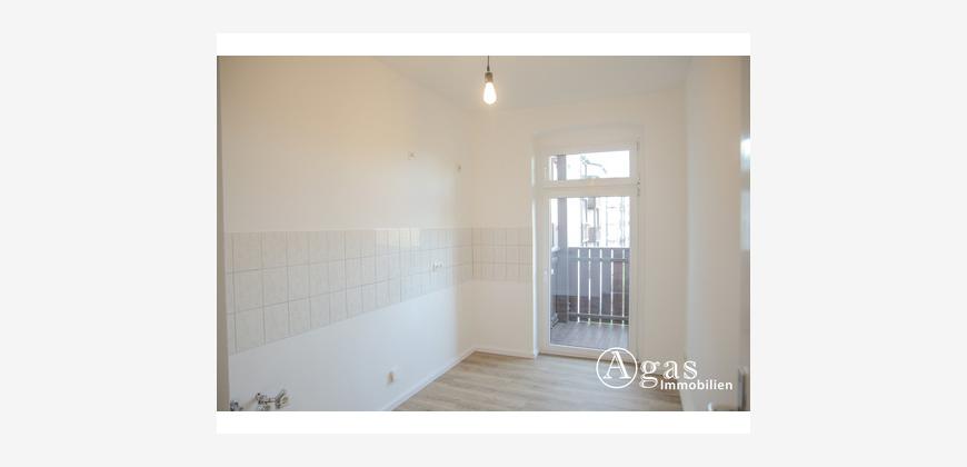 Die Küche überzeugt durch ihre praktische Aufteilung. Von hier aus gelangt man direkt auf den Balkon, der sich zur ruhigen Rückseite des Hauses orientiert. Hier lässt es sich wunderbar entspannen – perfekt für den morgendlichen Kaffee oder den Feierabend im Freien.