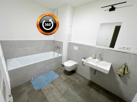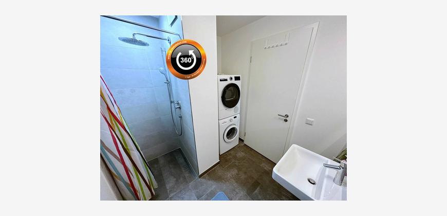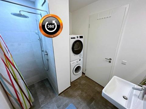 - Gäste-Duschbad mit ebenerdiger, gefliester Dusche, Rainshower-Duschkopf, XL-Feinsteinzeug-Fliesen, Waschmaschine und Trocknergerät (inklusive)